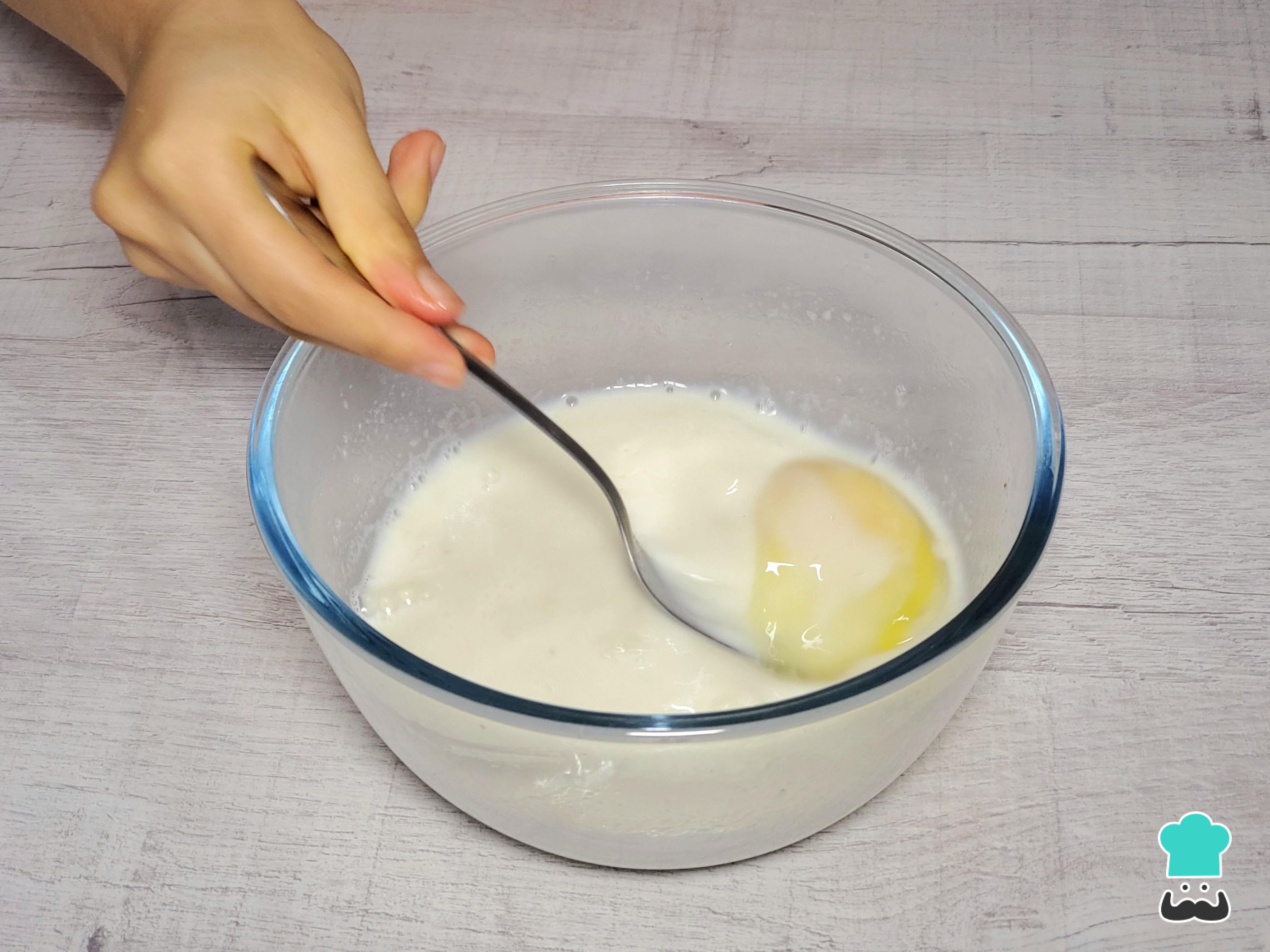 En un bowl vierte la leche tibia (casi fría) que quedó de la cocción y añade los huevos. Bate bien hasta que se integren.