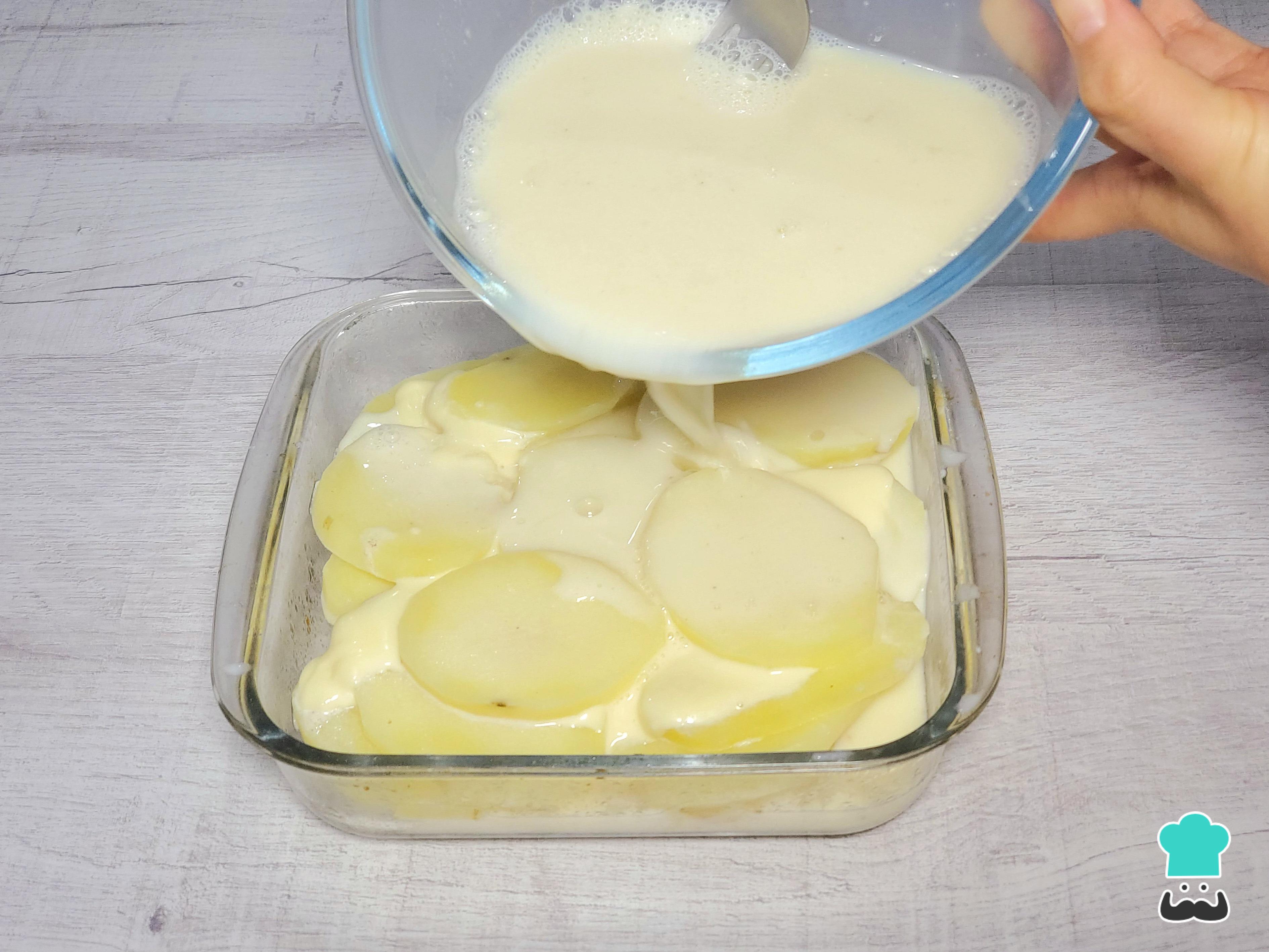Vierte la mezcla de leche y huevo sobre la bandeja con las papas. Termina con una última capa de queso y hornea a 180 °C por aproximadamente 20 minutos, o hasta que la superficie se dore bien.