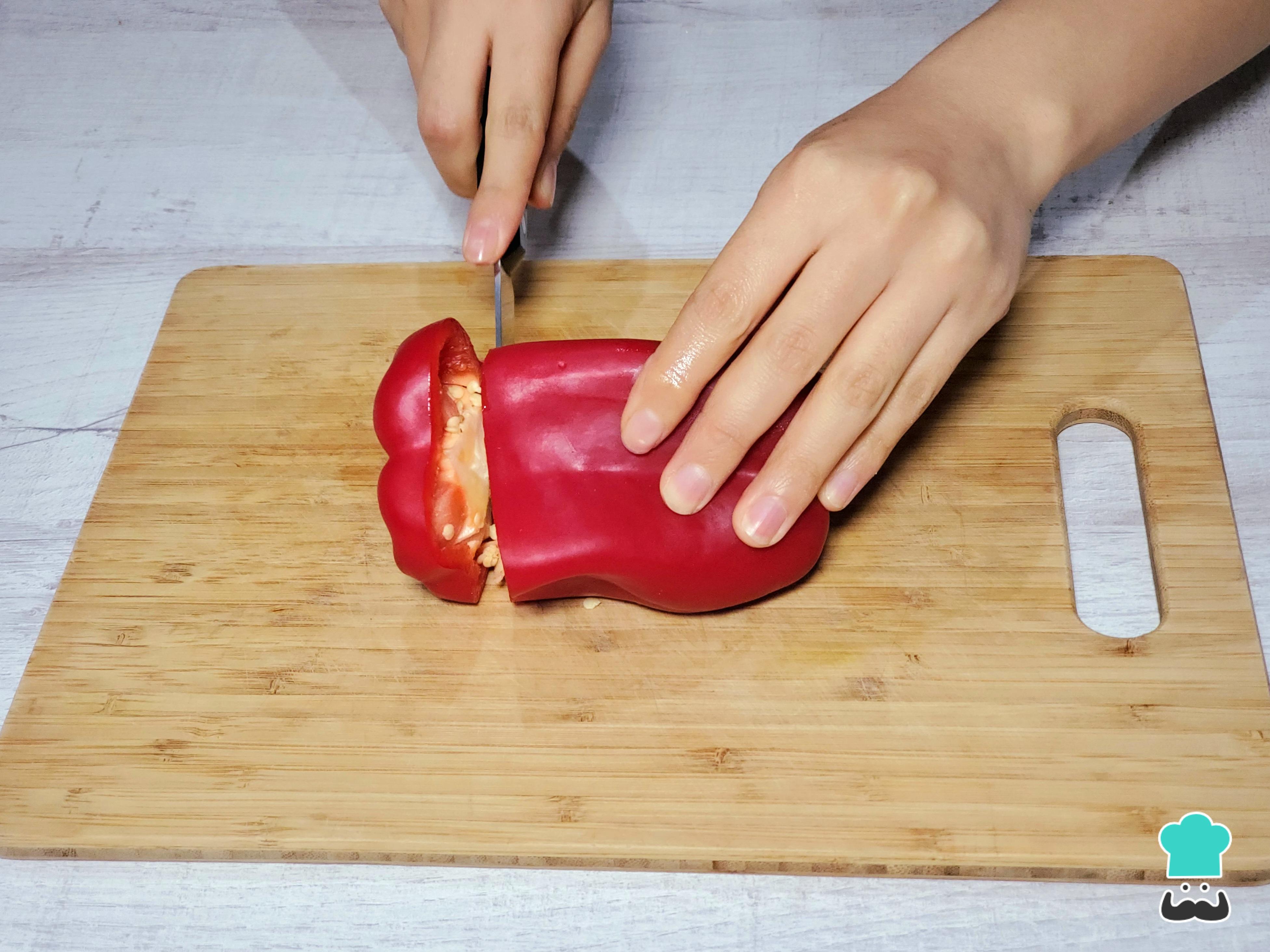 Para preparar el rocoto relleno, empieza cortando la parte superior de los rocotos y retirando las venas y semillas. Es recomendable usar guantes durante este proceso.