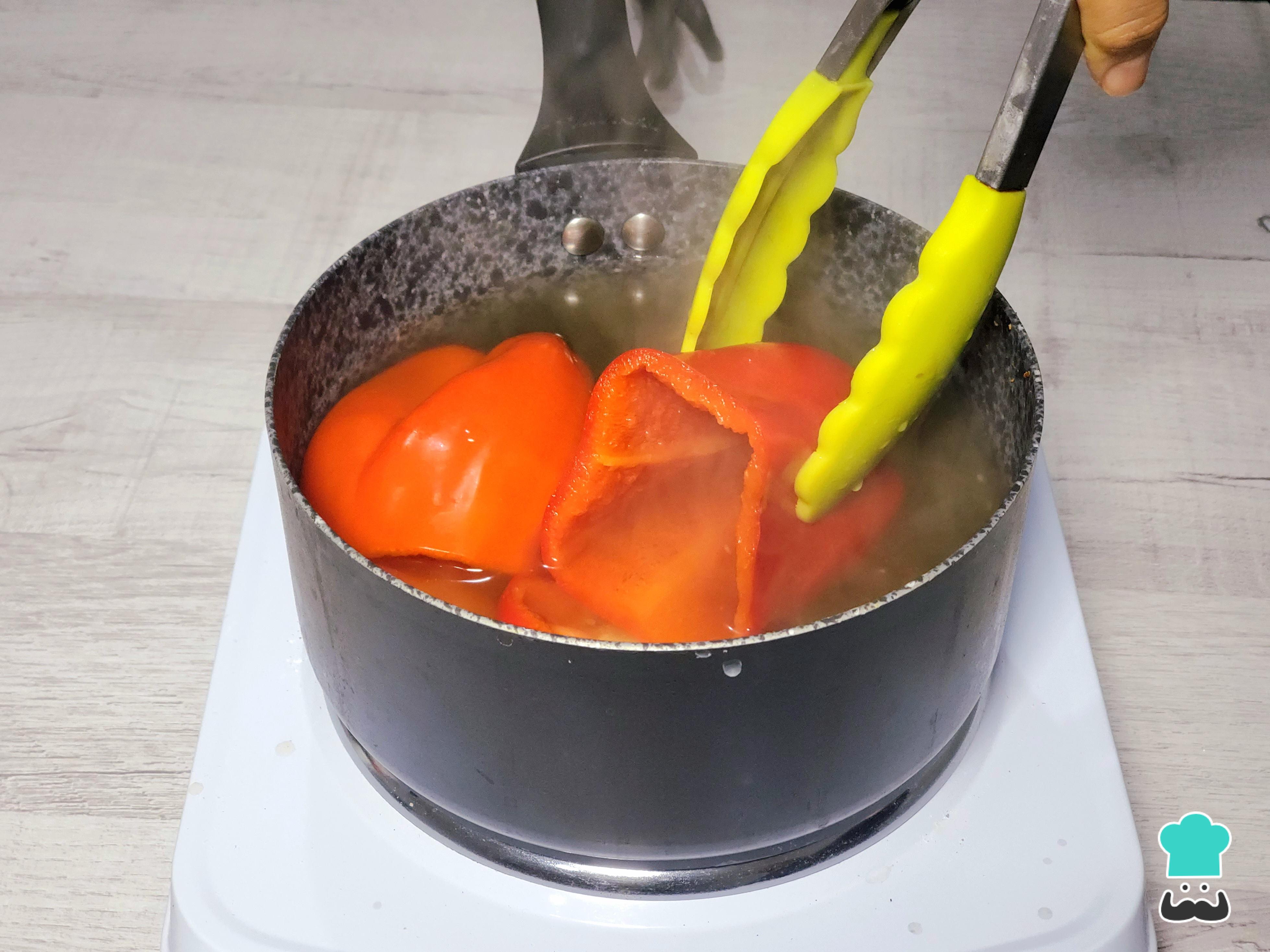 Para reducir el picor, coloca los rocotos en una olla con abundante agua, vinagre, sal y azúcar. Hierve durante 5 minutos, luego escurre el agua y repite este proceso de 2 a 3 veces más hasta que el picor disminuya. Reserva los rocotos.