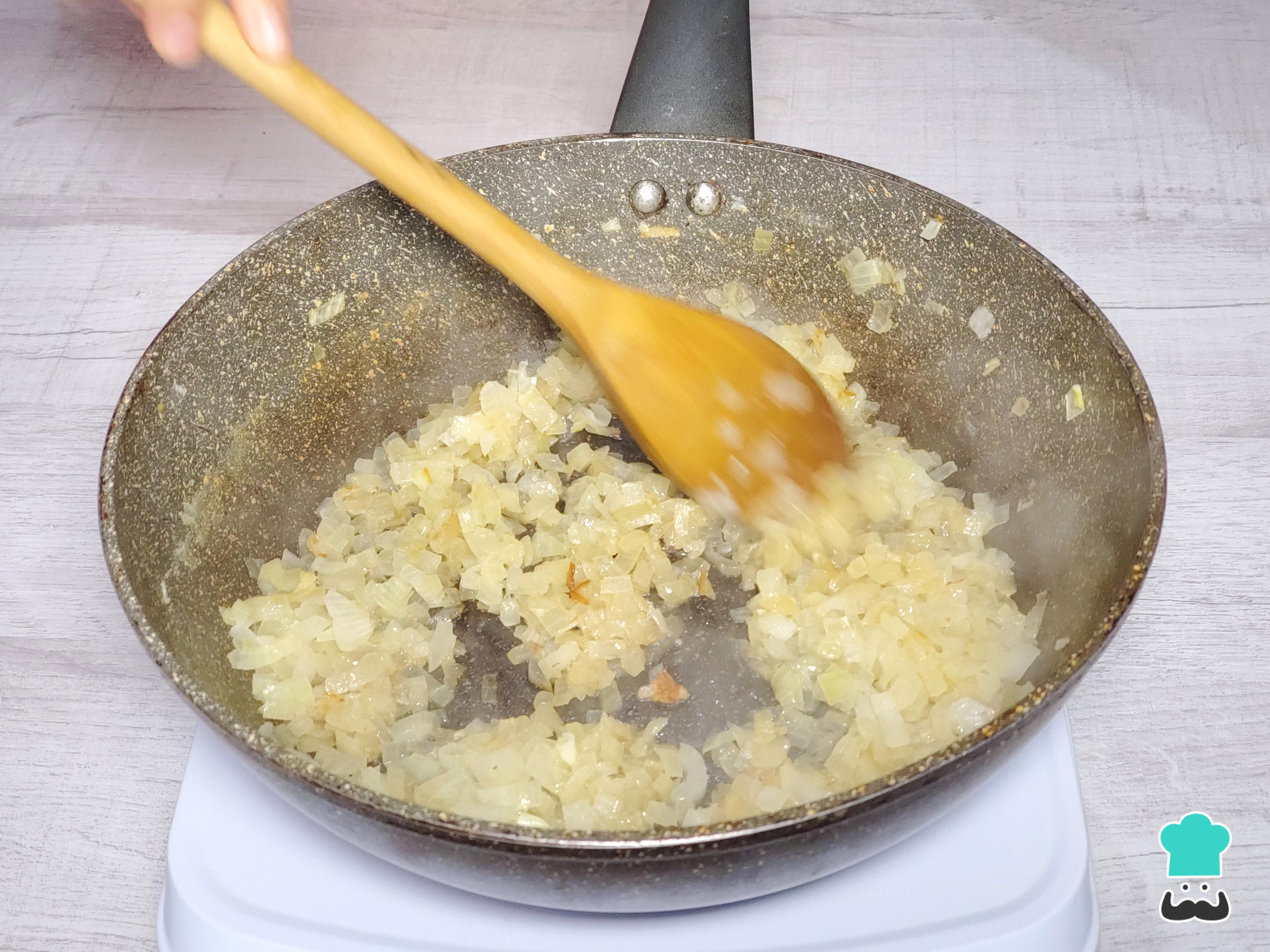 En una sartén, sofríe la cebolla finamente picada con un buen chorro de aceite hasta que esté transparente.