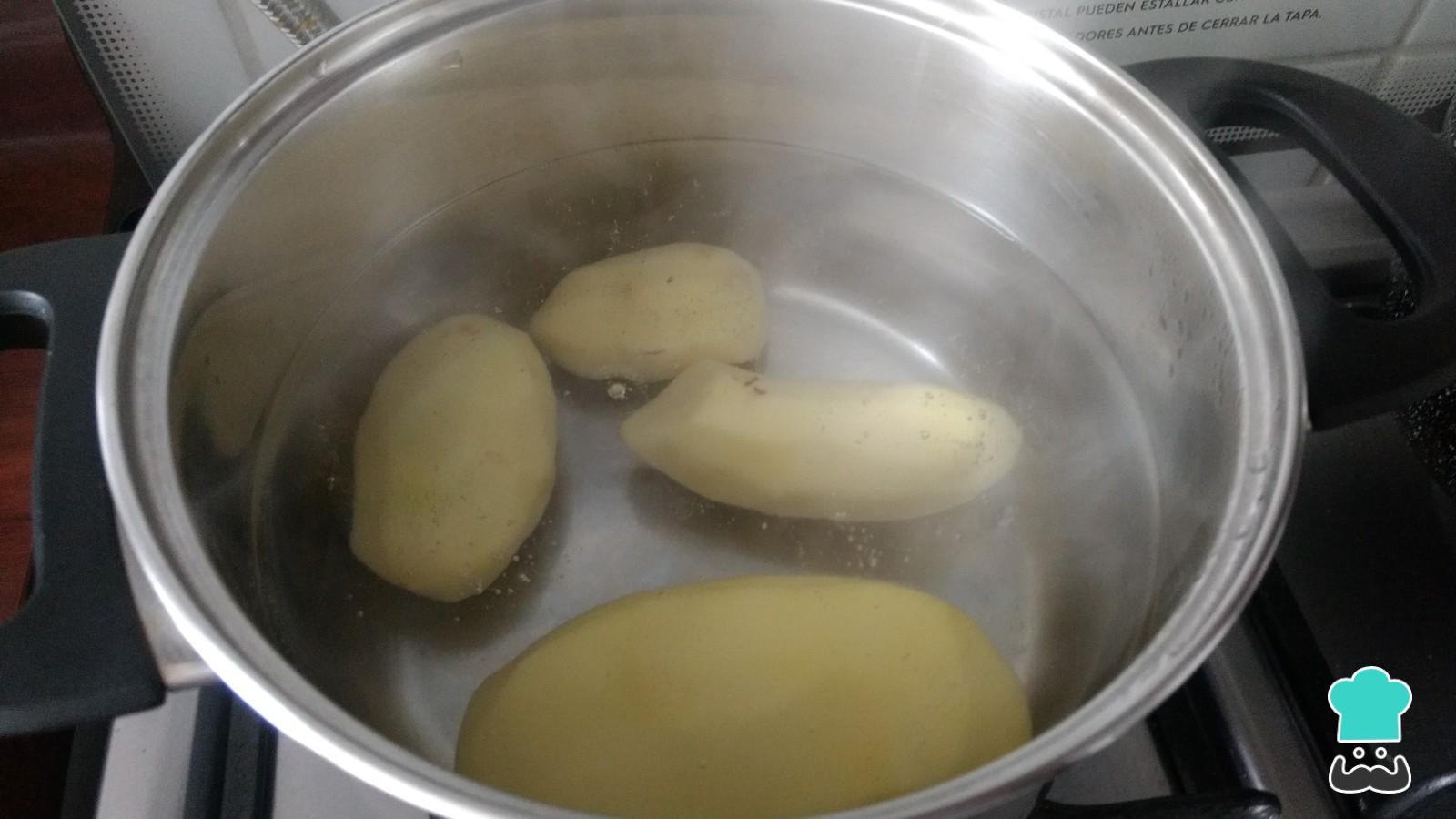 Lava las papas muy bien y quítales la piel. Mete las papas en en una olla con suficiente agua para cubrirlas, hiérvelas de 15 a 20 minutos.