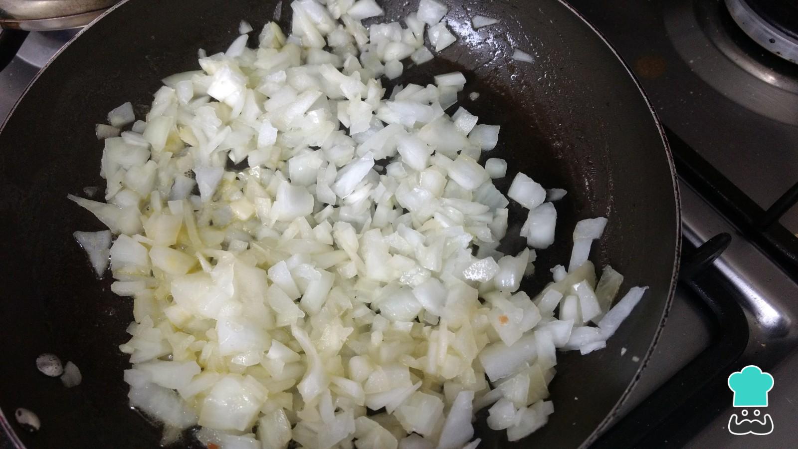 Corta la cebolla en cubitos pequeños y sofríela en una sartén con un poco de aceite.