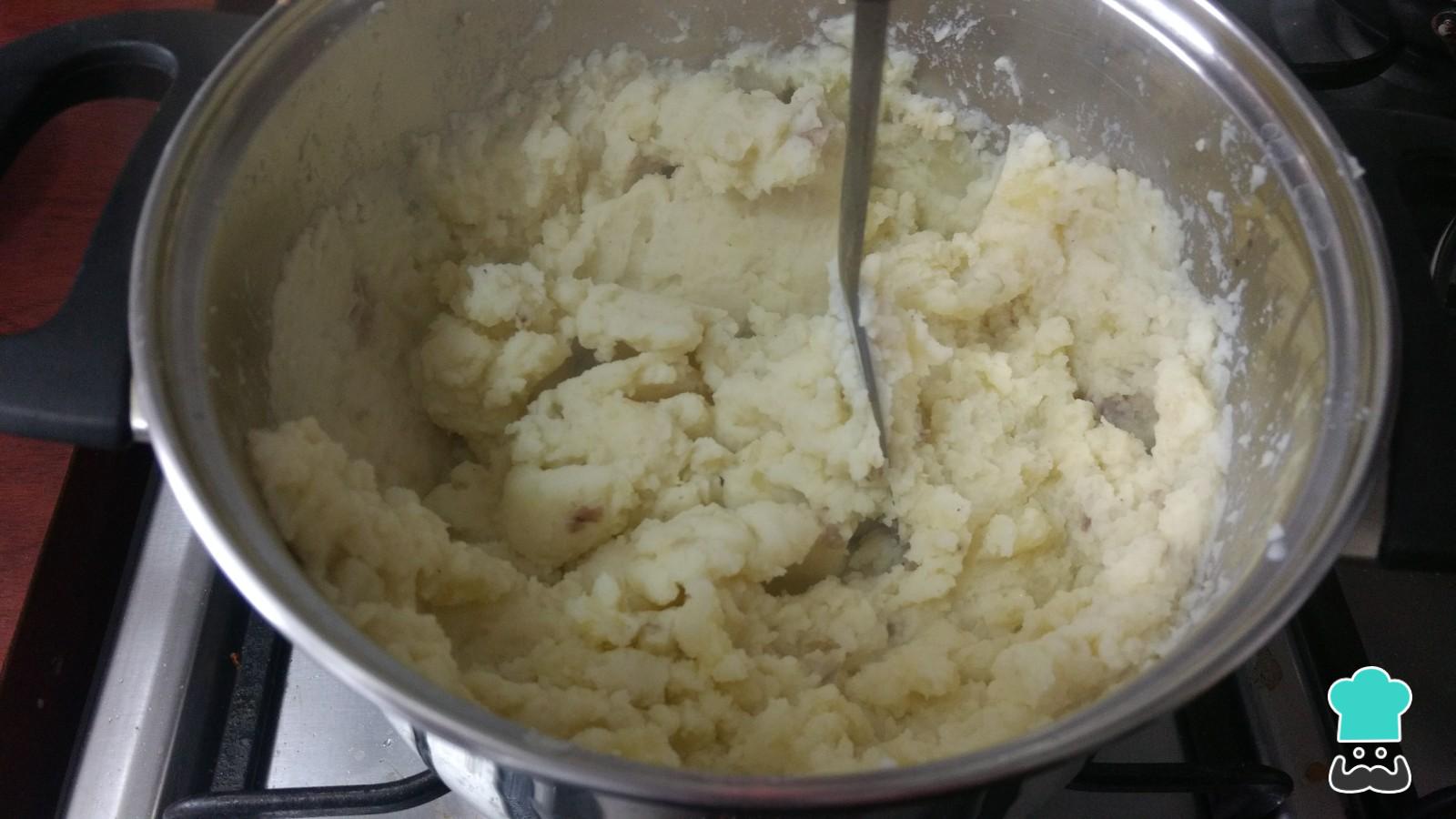 Cuando estén blandas las papas, agrega la mantequilla, la sal y la leche. Procede a pisar las papas con un tenedor o pisa papas.