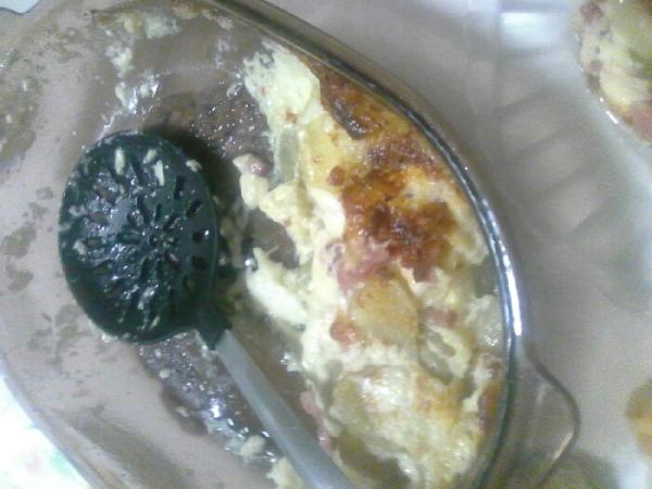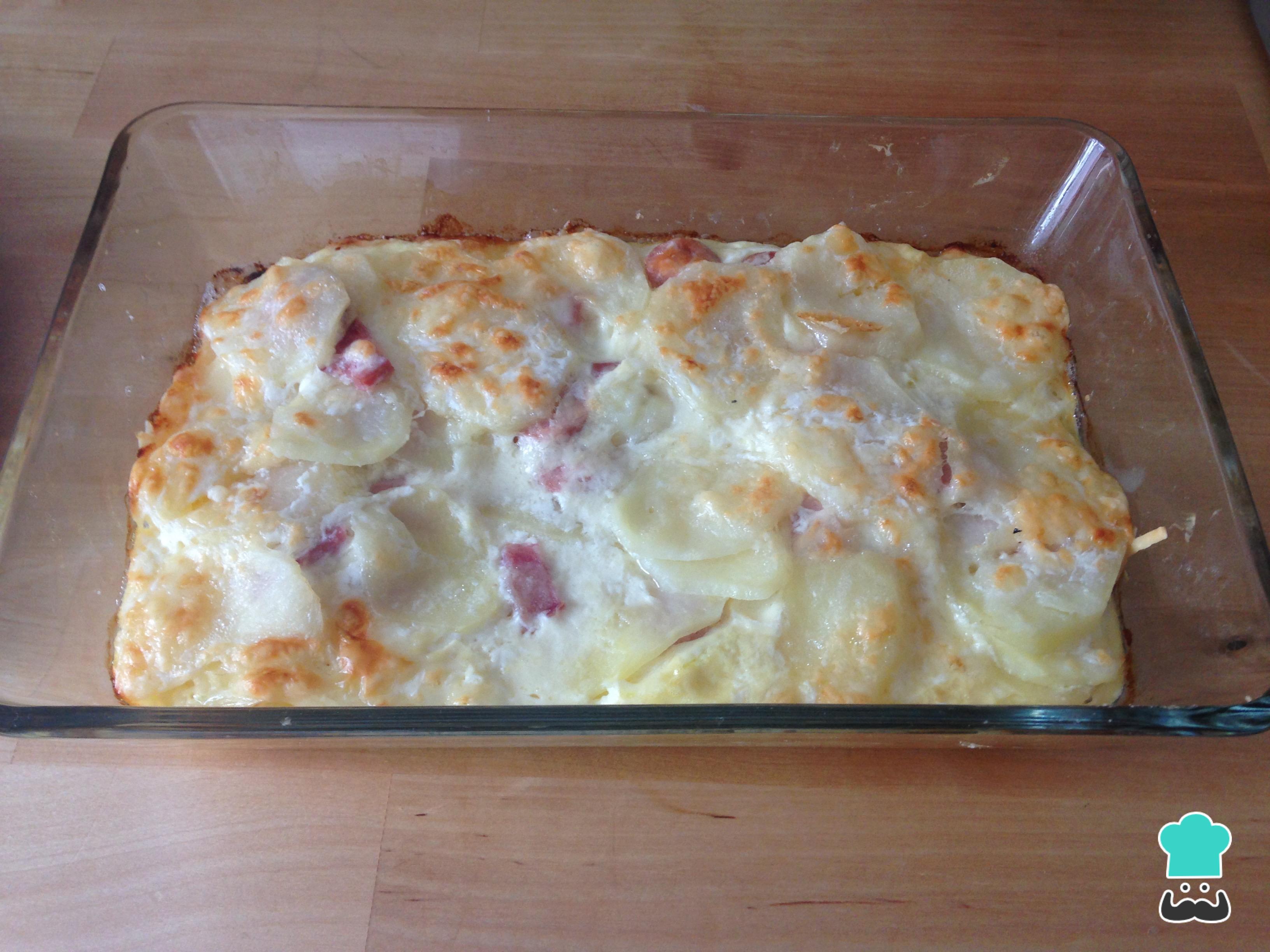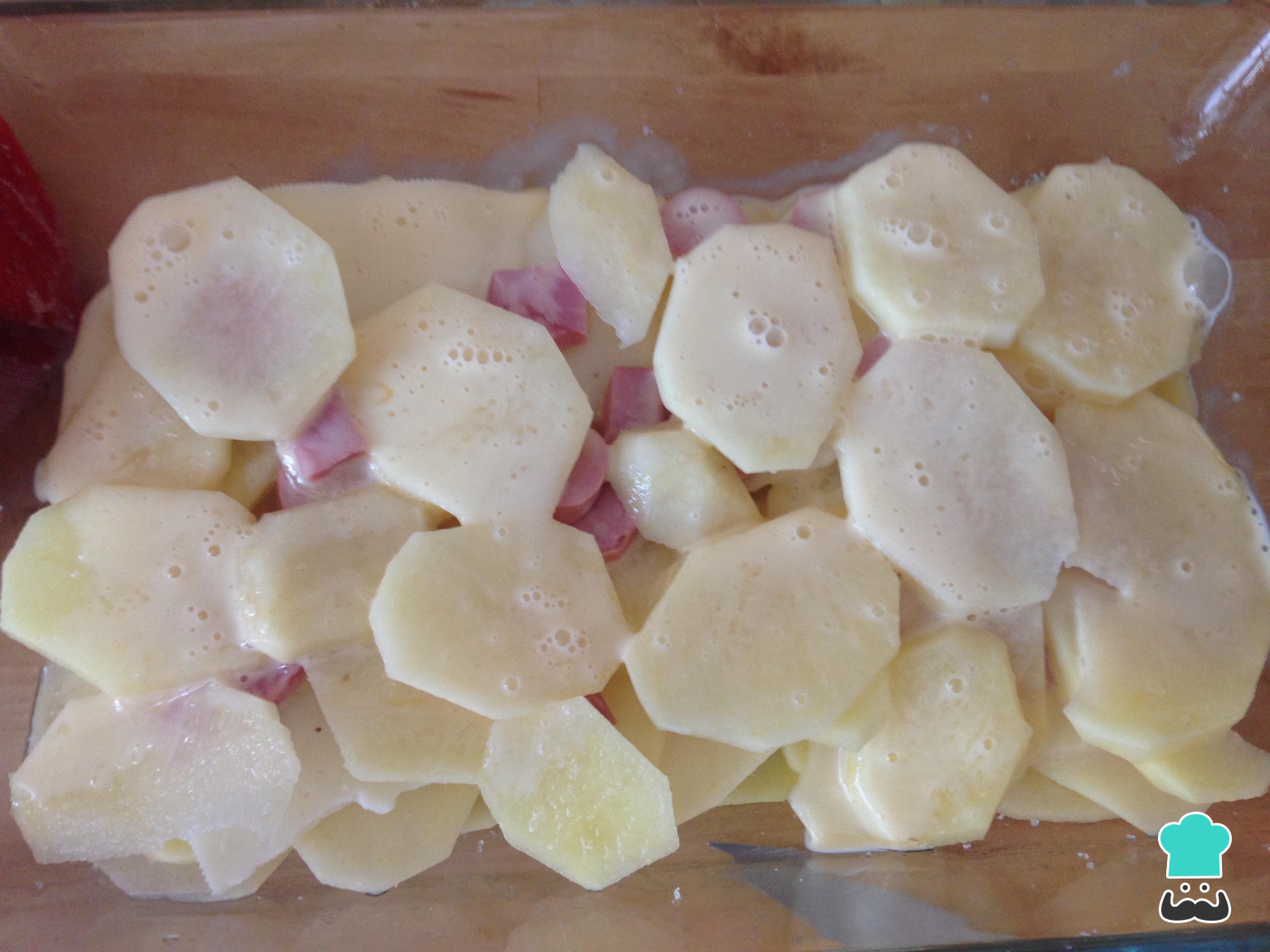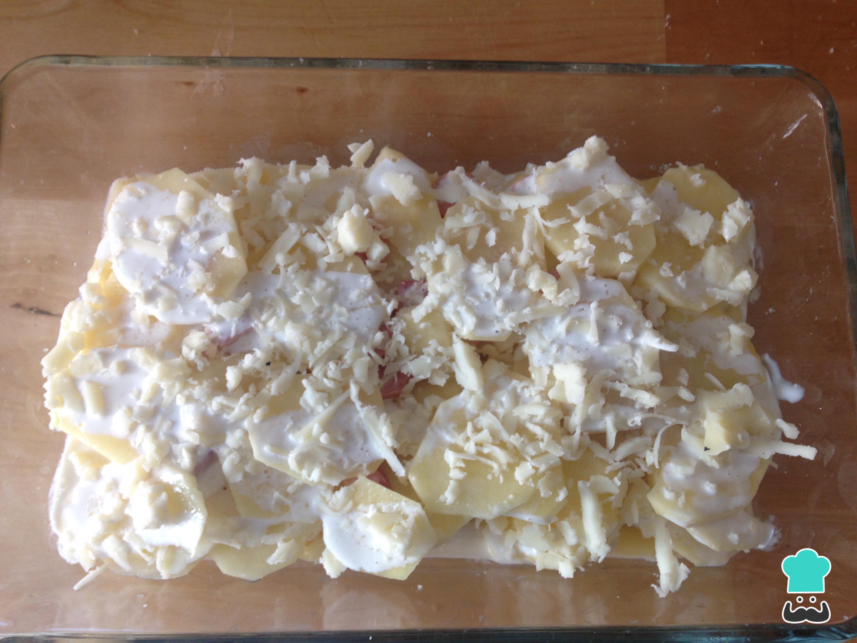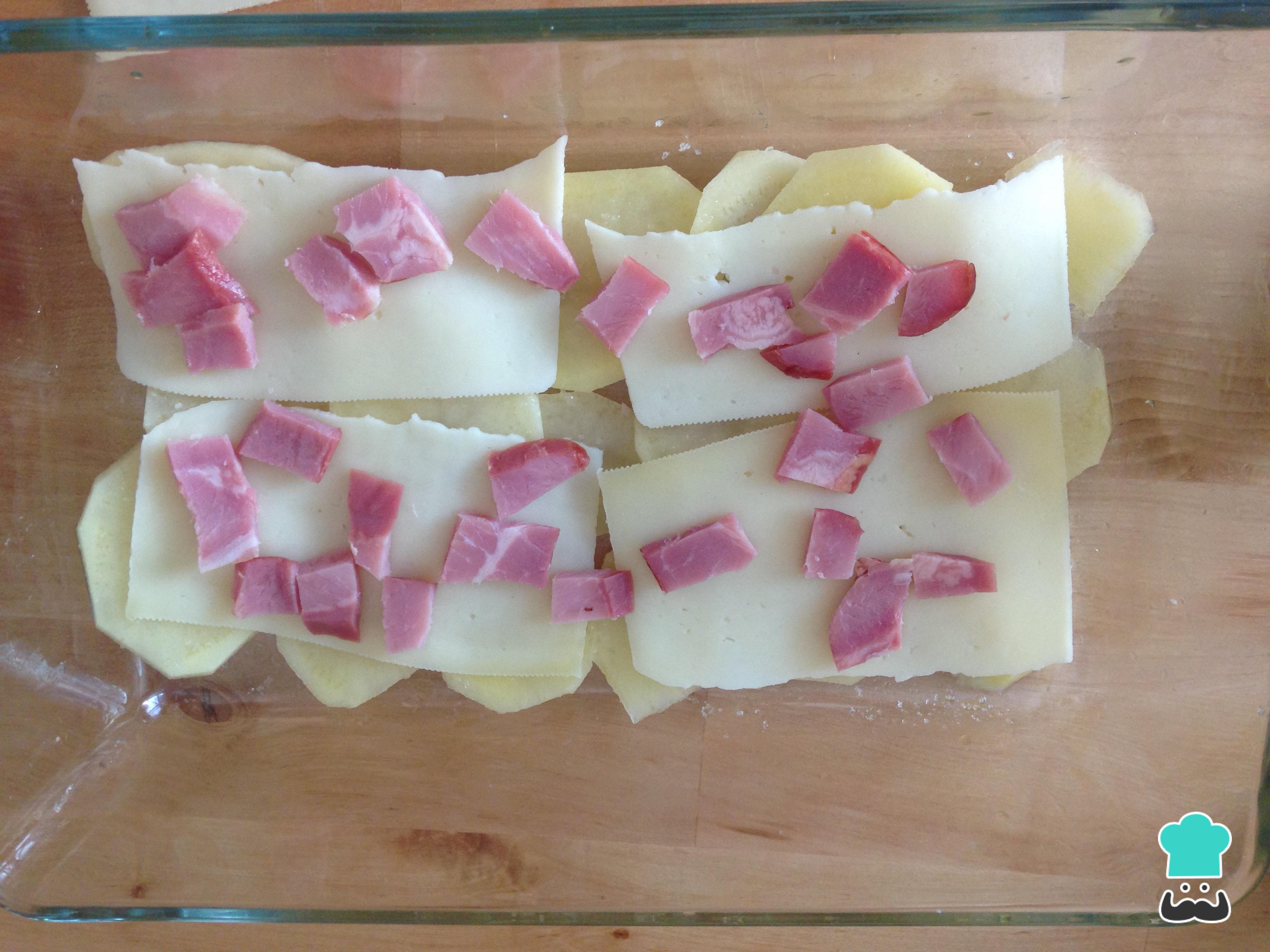 Ahora disponemos el bacon sobre el queso. Podemos ponerlo en lonchas o picado en dados. Volvemos a poner una capa de patatas, otra de queso y otra de bacon.
