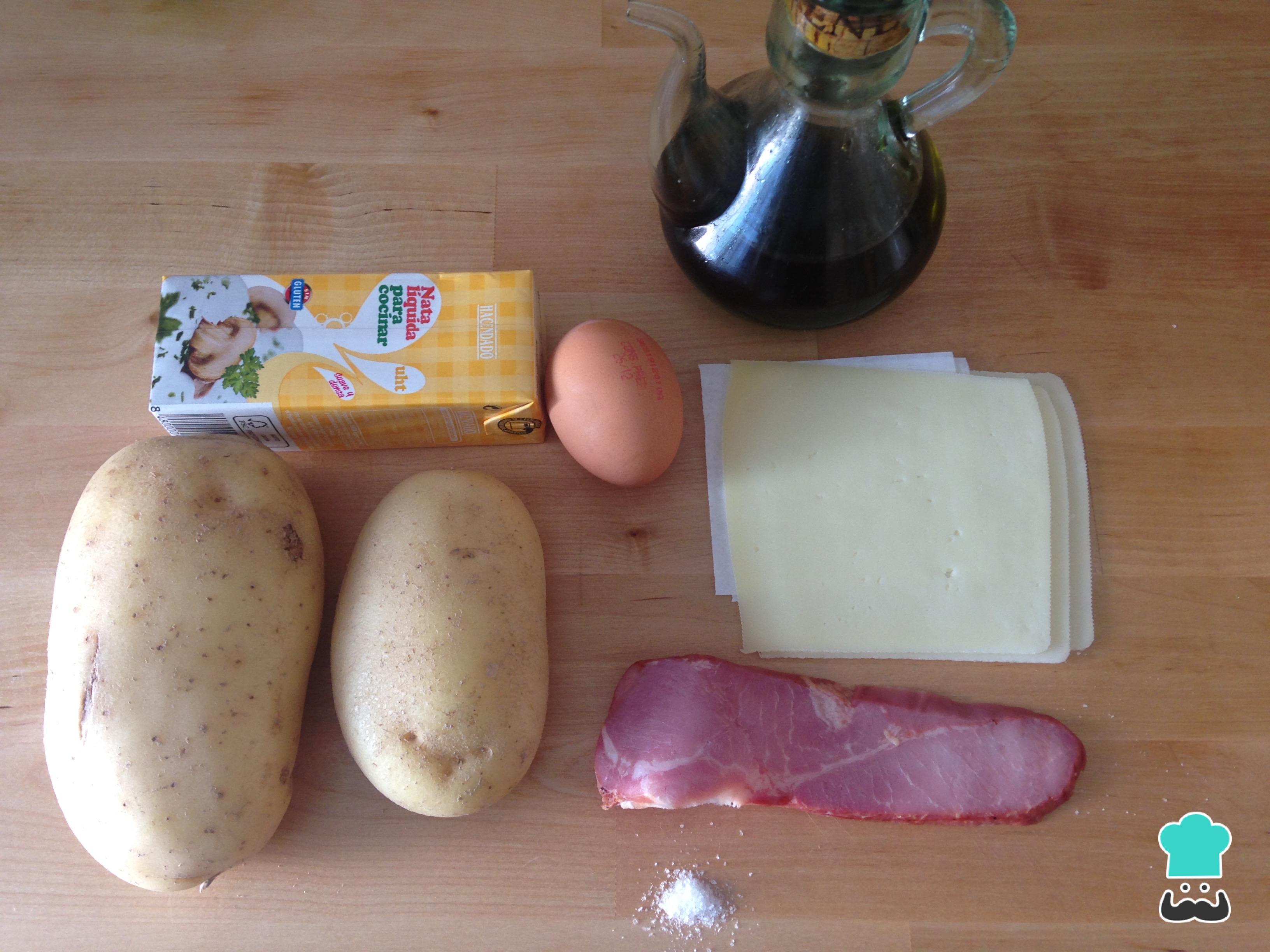Reunimos todos los ingredientes para elaborar el pastel de patata con bacon y queso.