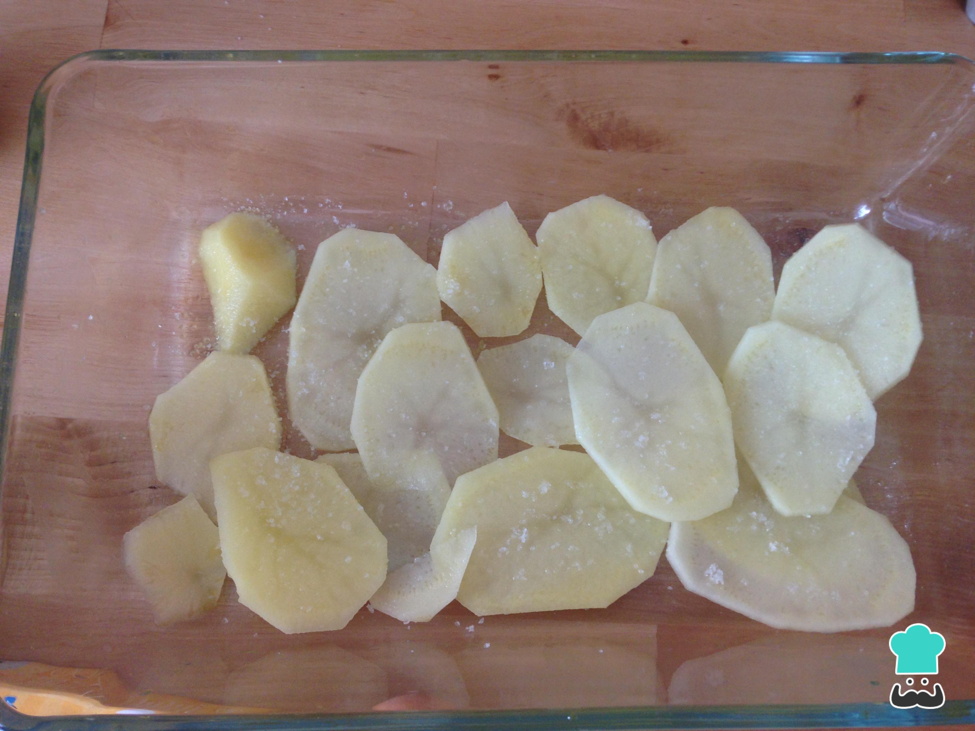 Pelamos las patatas, las lavamos y las cortamos en rodajas finas. Las vamos disponiendo en una fuente de horno con la base engrasada con un poco de aceite de oliva. Añadimos sal a la capa de patatas.