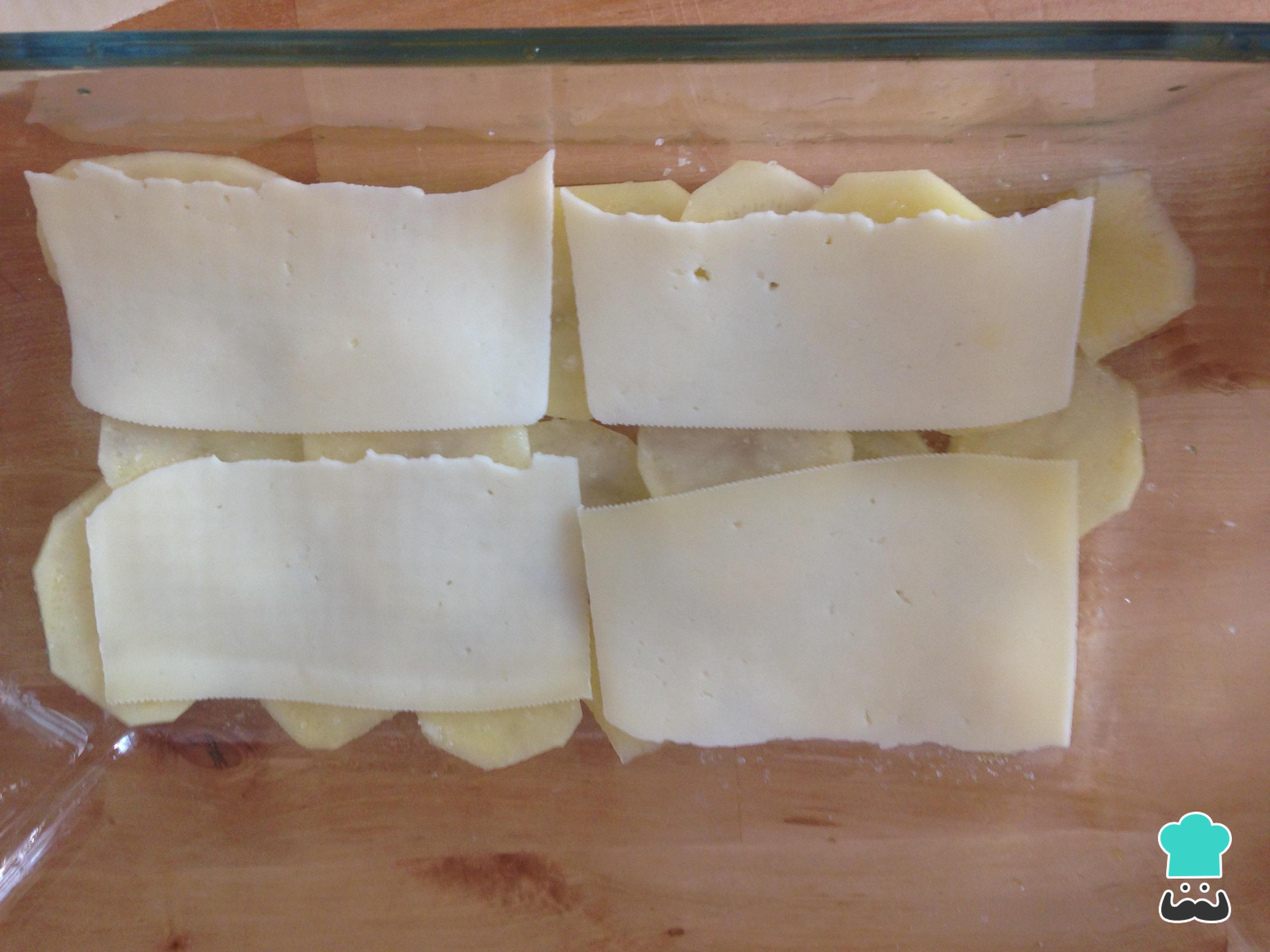 A continuación, disponemos el queso en lonchas sobre las patatas. Hemos utilizado un queso tierno light pero también podéis usar cualquier queso que funda bien.