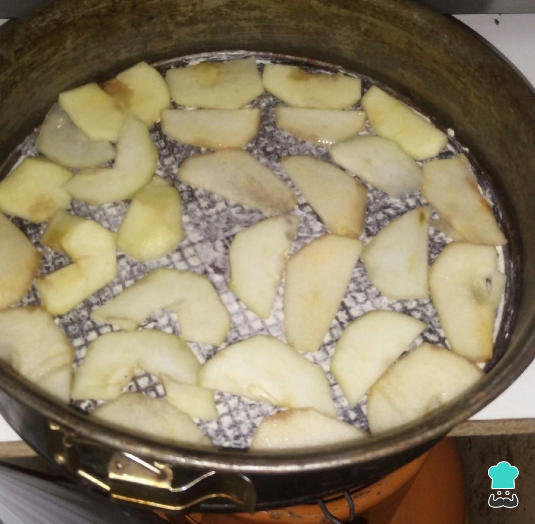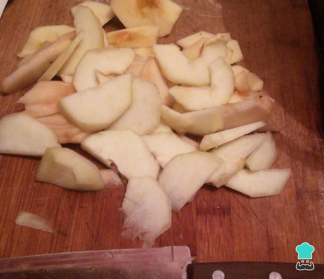 Aquí debemos pelar y cortar las peras con las manzanas en láminas delgadas.