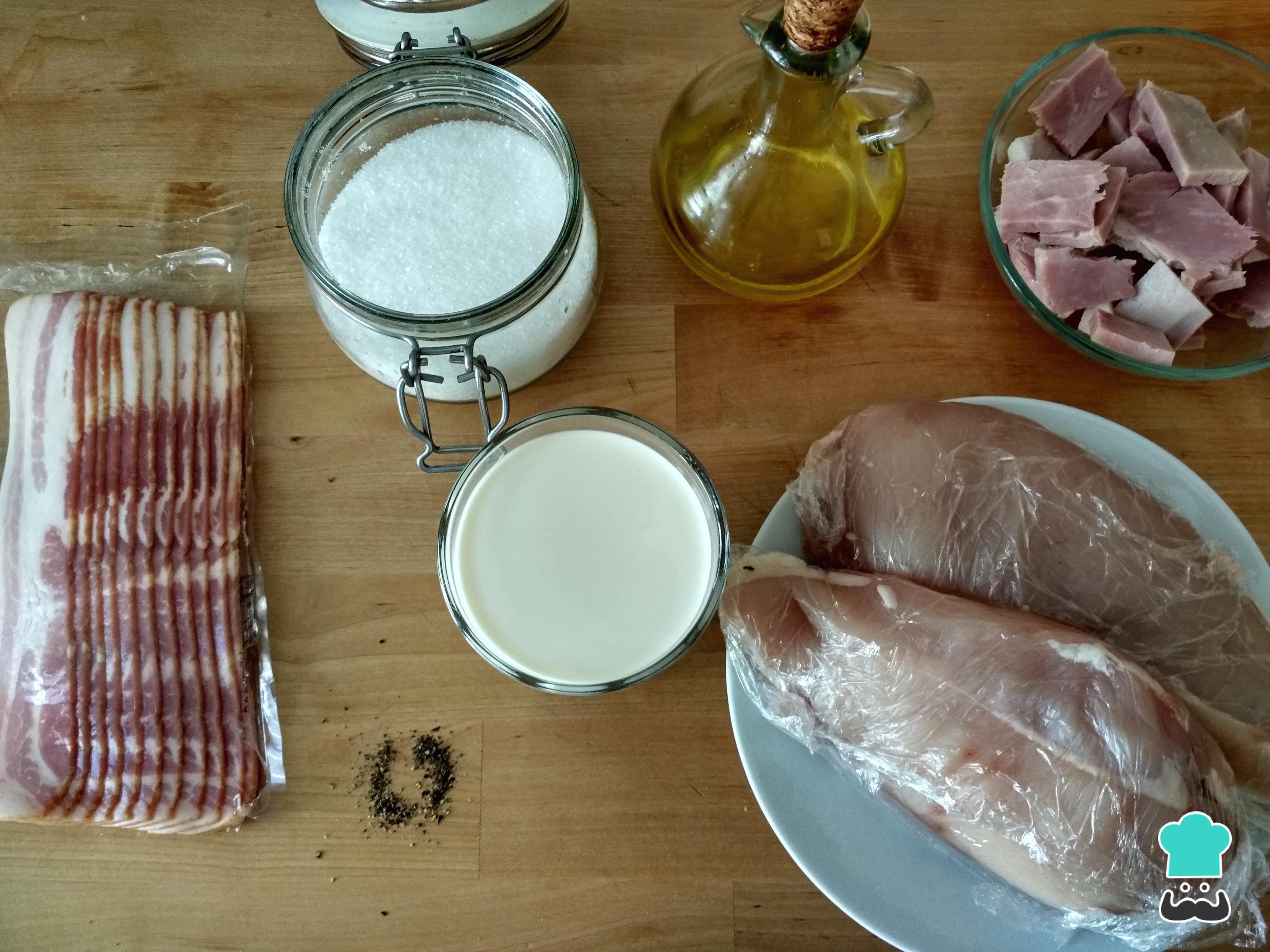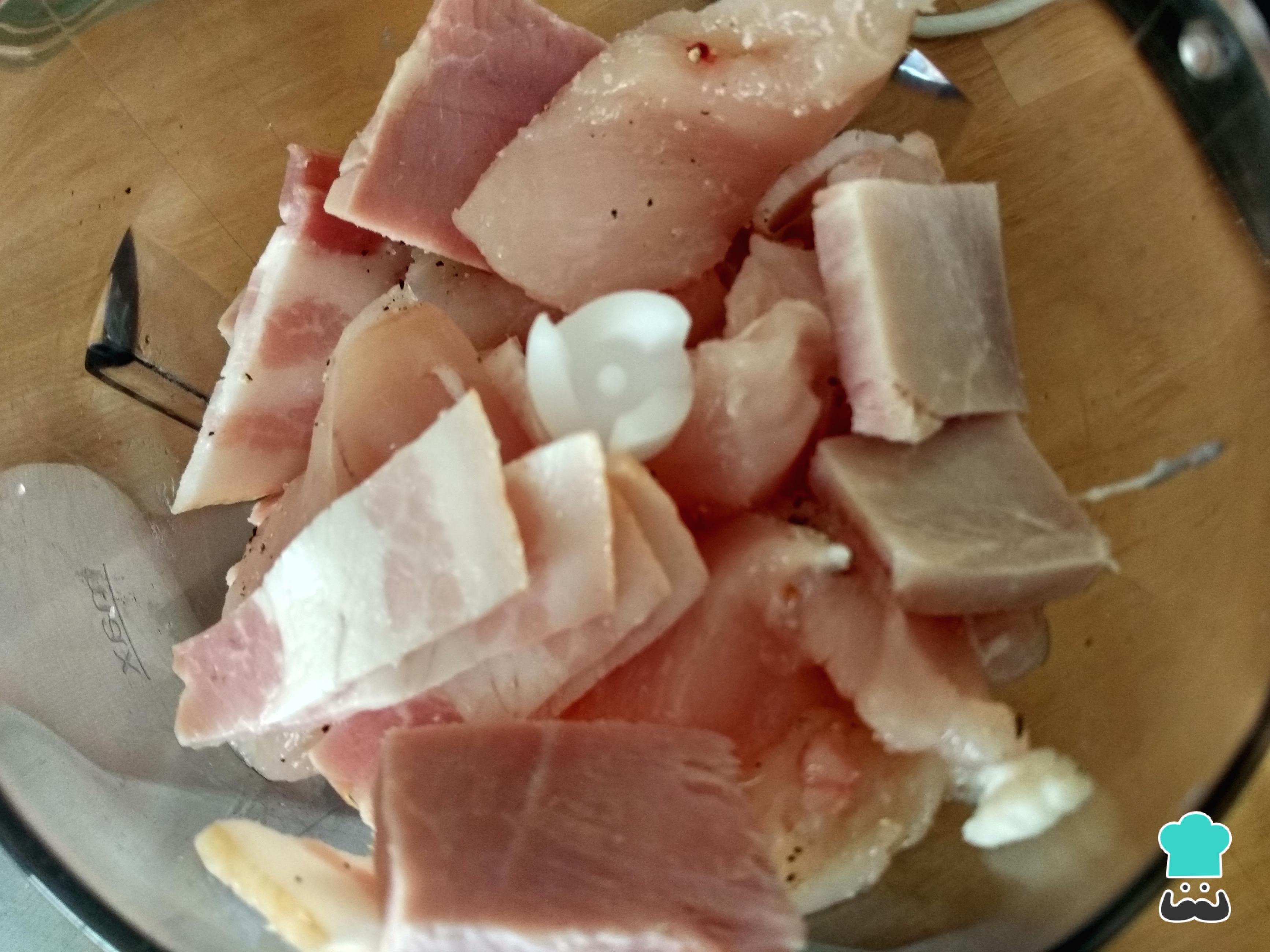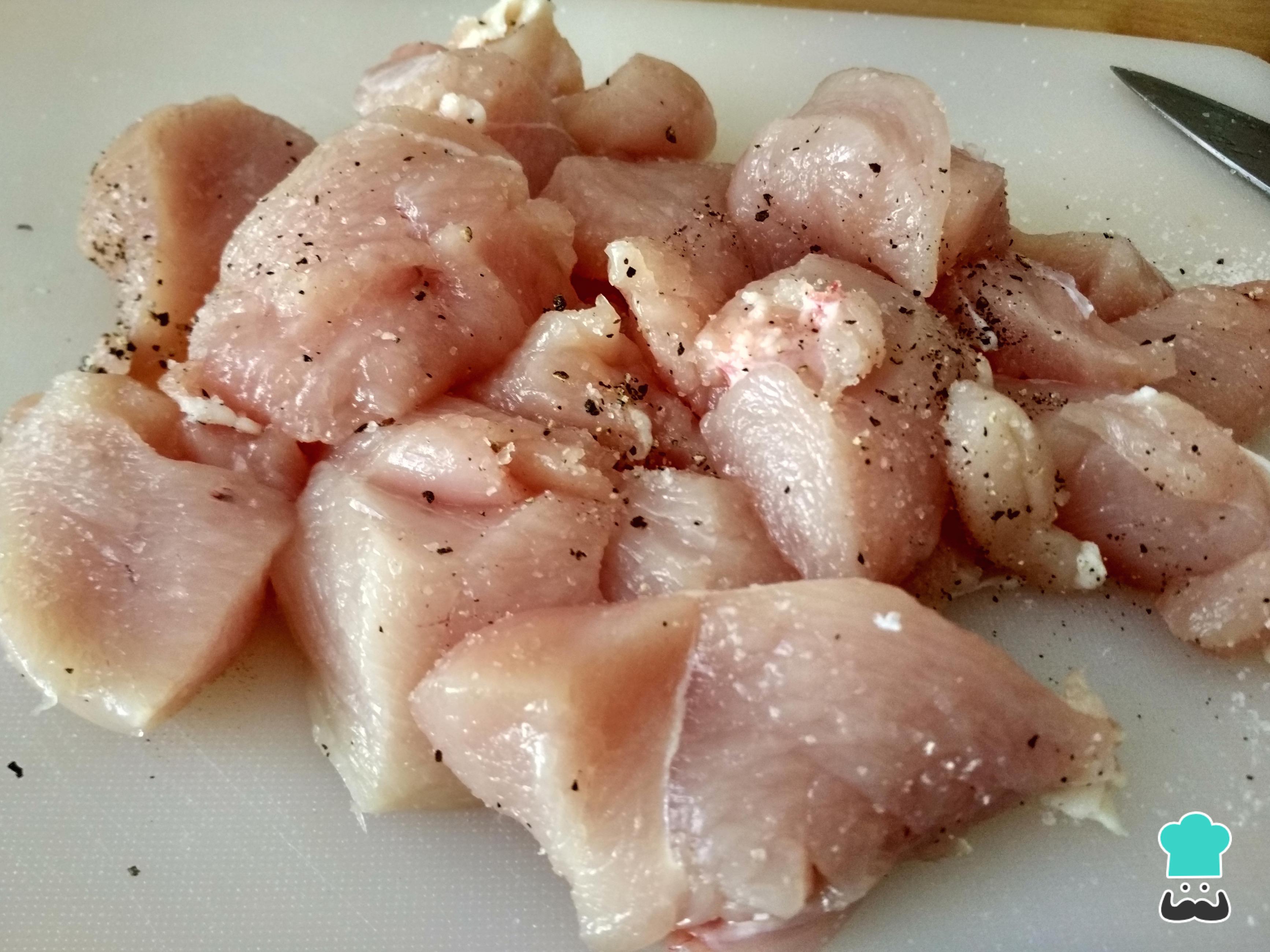 Troceamos y salpimentamos la pechuga de pollo. Al trocearla costará menos picarla en la máquina y ahorraremos tiempo. Del mismo modo, picamos el resto de ingredientes en trozos más pequeños, tanto el bacon como el jamón cocido.