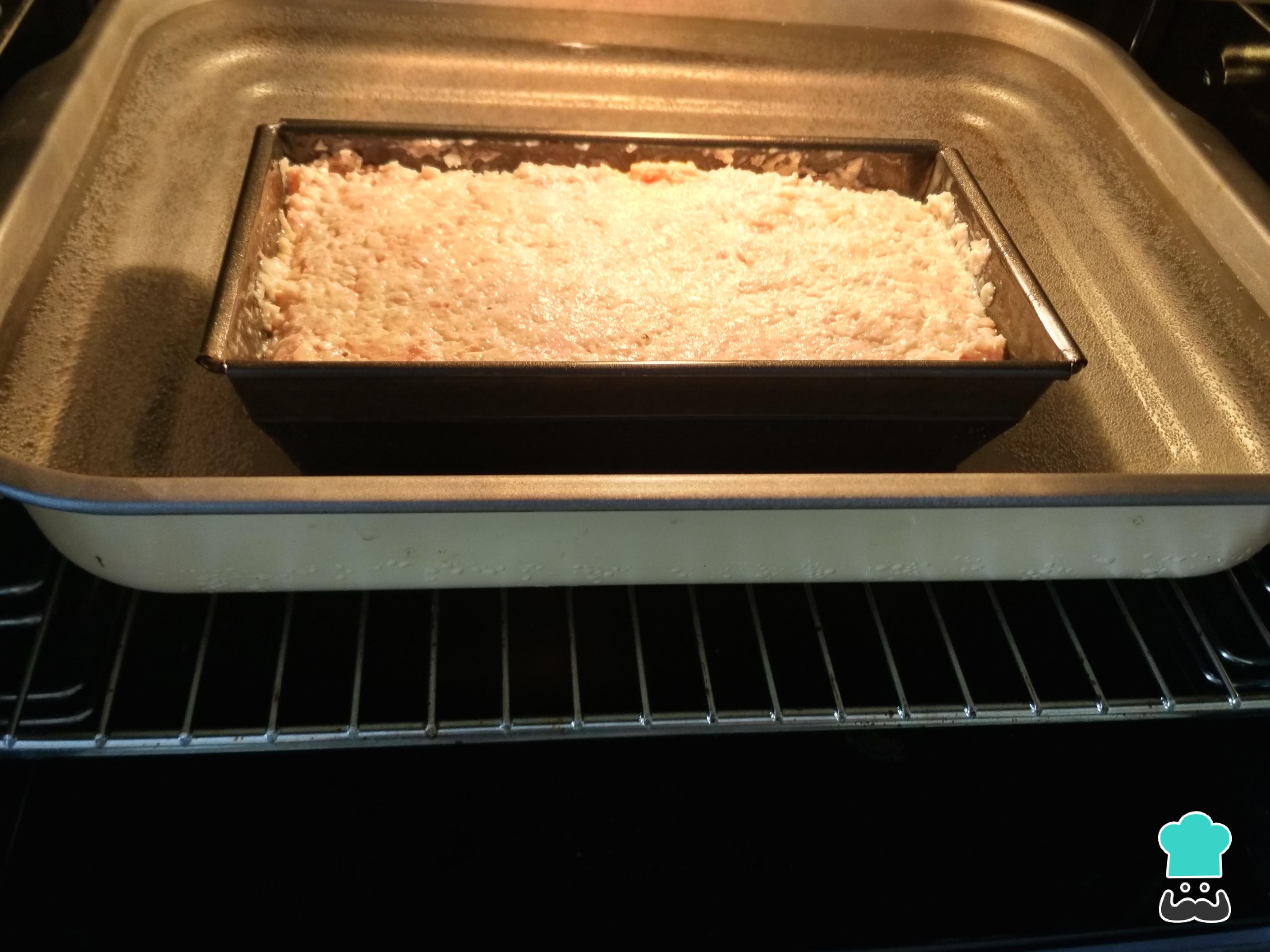 Engrasamos un bol alto y pasamos la mezcla a este recipiente. Metemos el pastel de pollo y bacon en el horno al baño María a 180 ºC durante 30-35 minutos.
