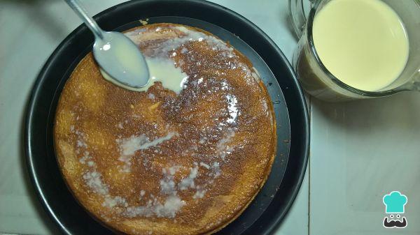 Cuando el bizcocho esté un poco frío báñalo con la mezcla anterior y deja que se impregne bien, sin retirarlo del molde. Mientras tanto, prepara un merengue casero siguiendo los pasos de esta sencilla receta.