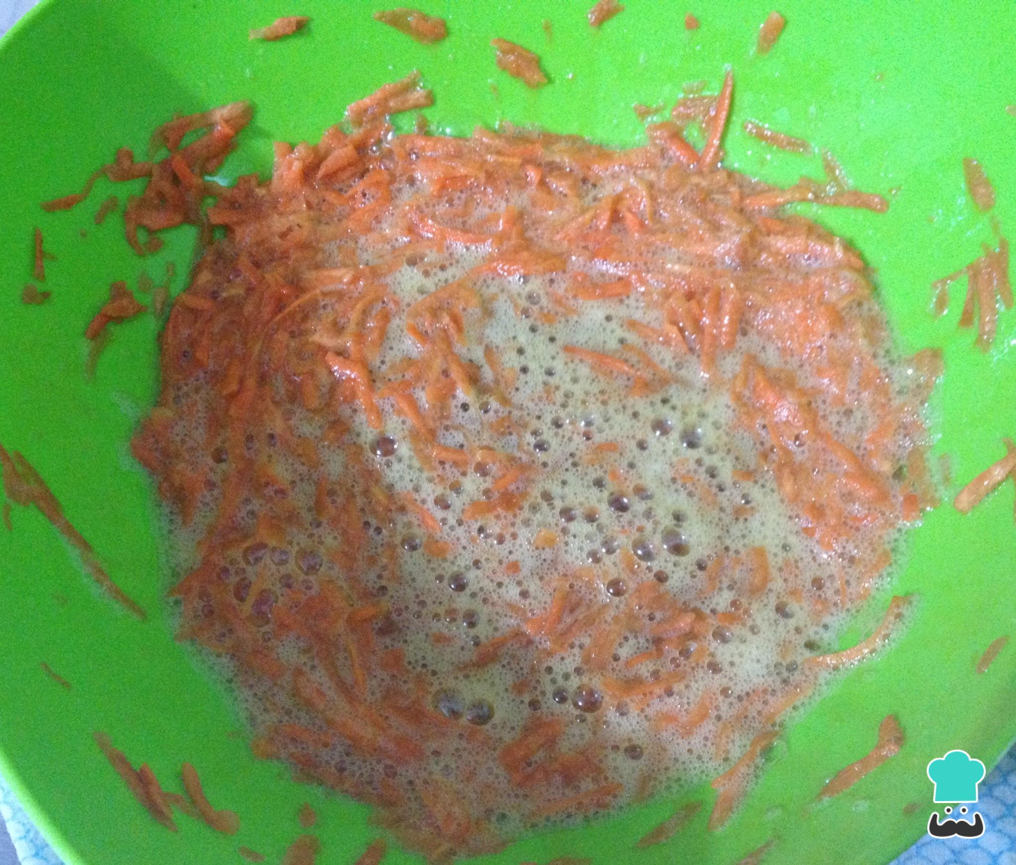 En un tazón batir los huevos con el azúcar hasta obtener una mezcla homogénea. Luego agregar la canela, la zanahoria y el aceite de oliva, mezclar.