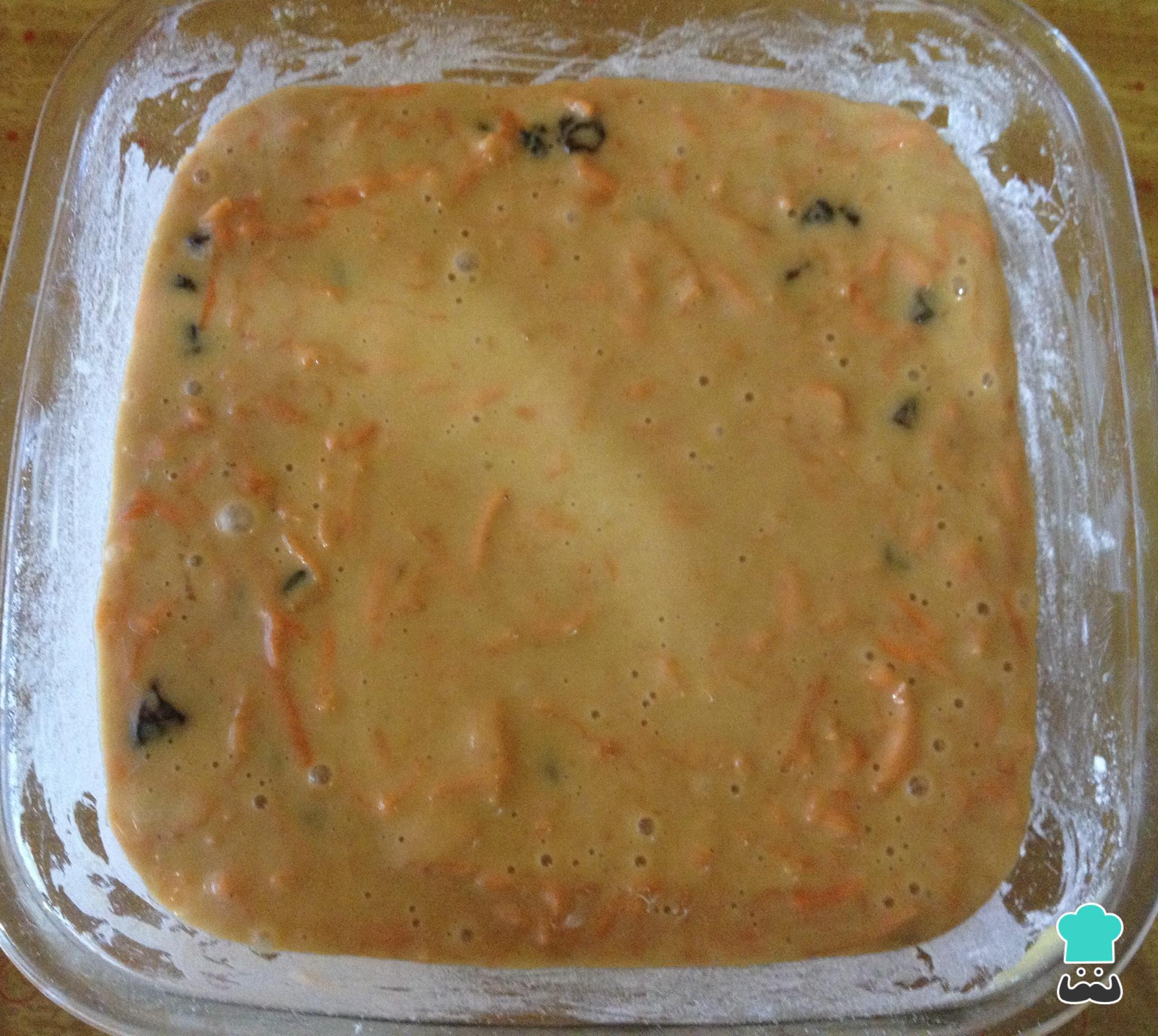 Prepara un molde para horno con mantequilla y harina y vacía en él la mezcla de la torta de zanahoria. Hornear a 180° C. durante 35 minutos.