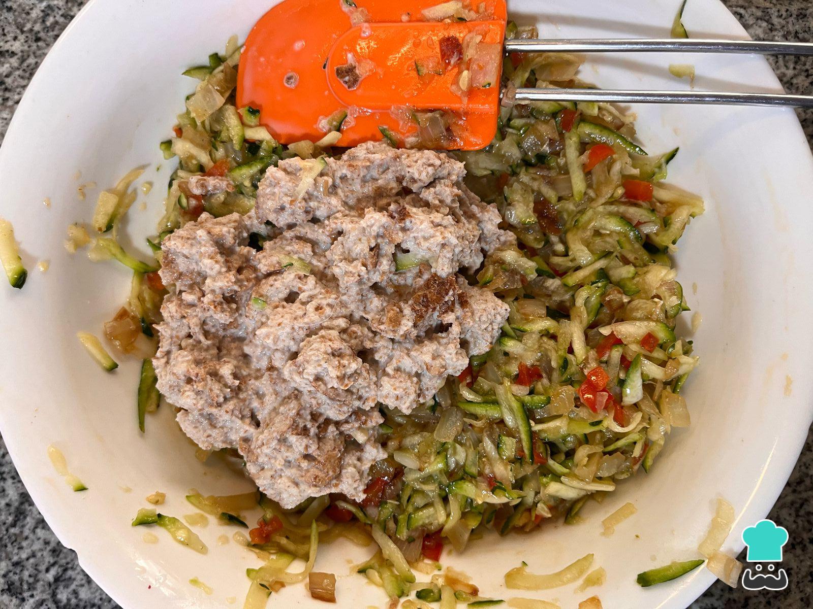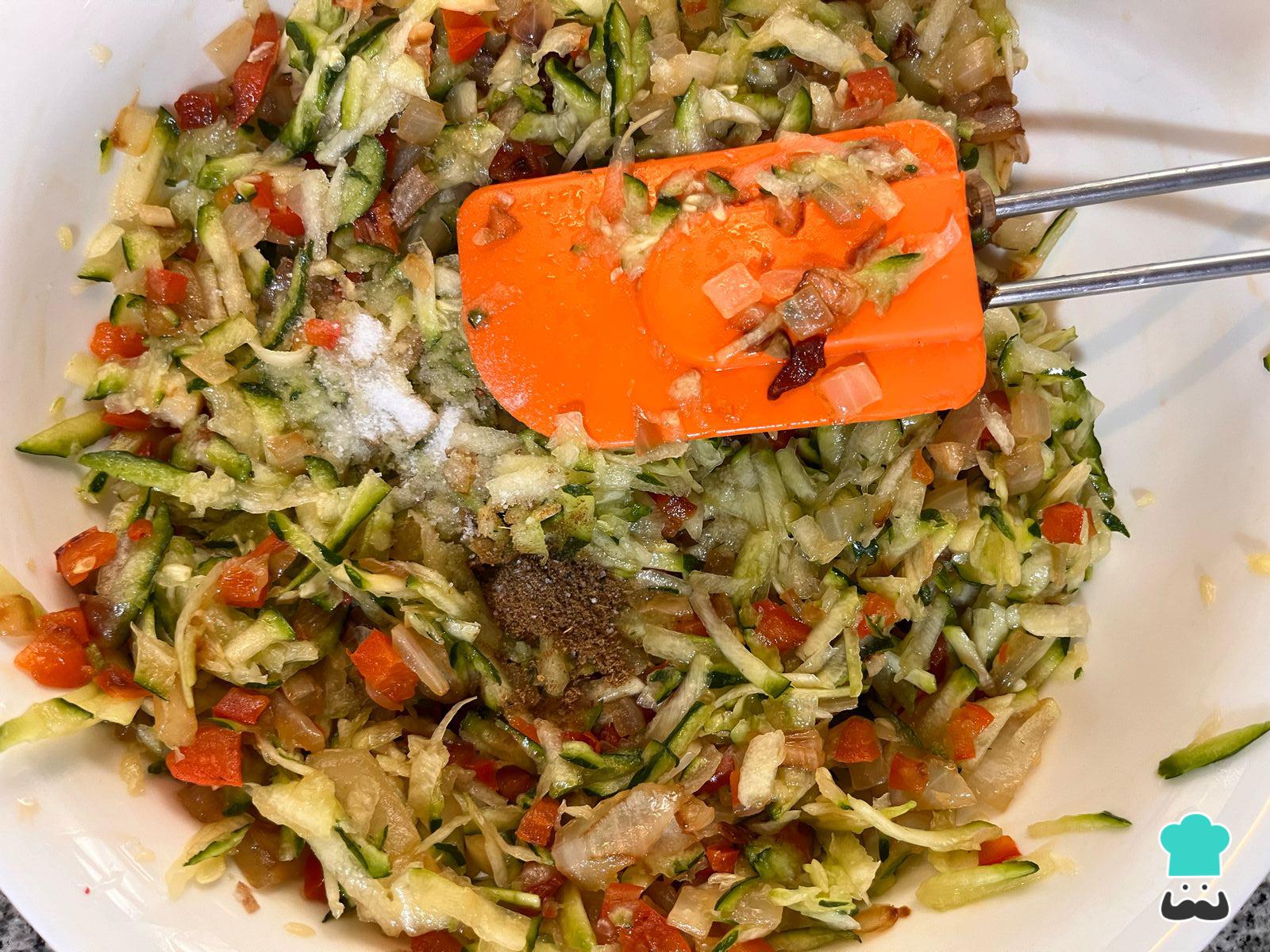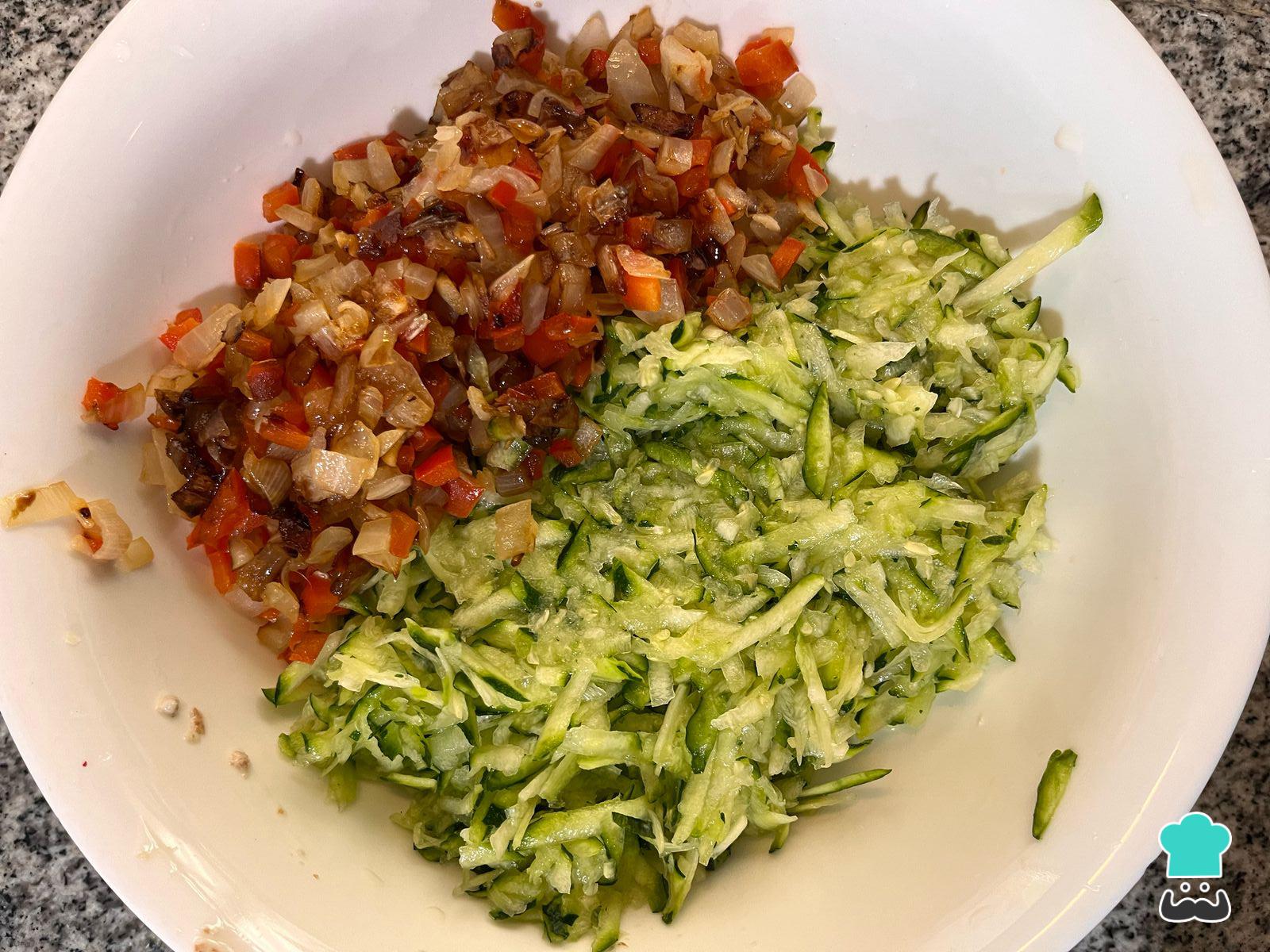 En un bol grande añade el zapallo italiano y el sofrito de cebolla y pimentón.