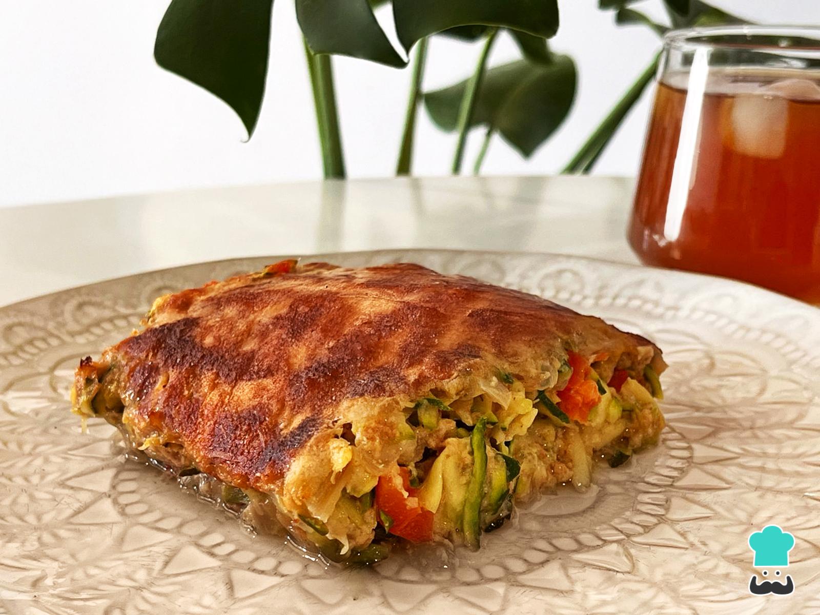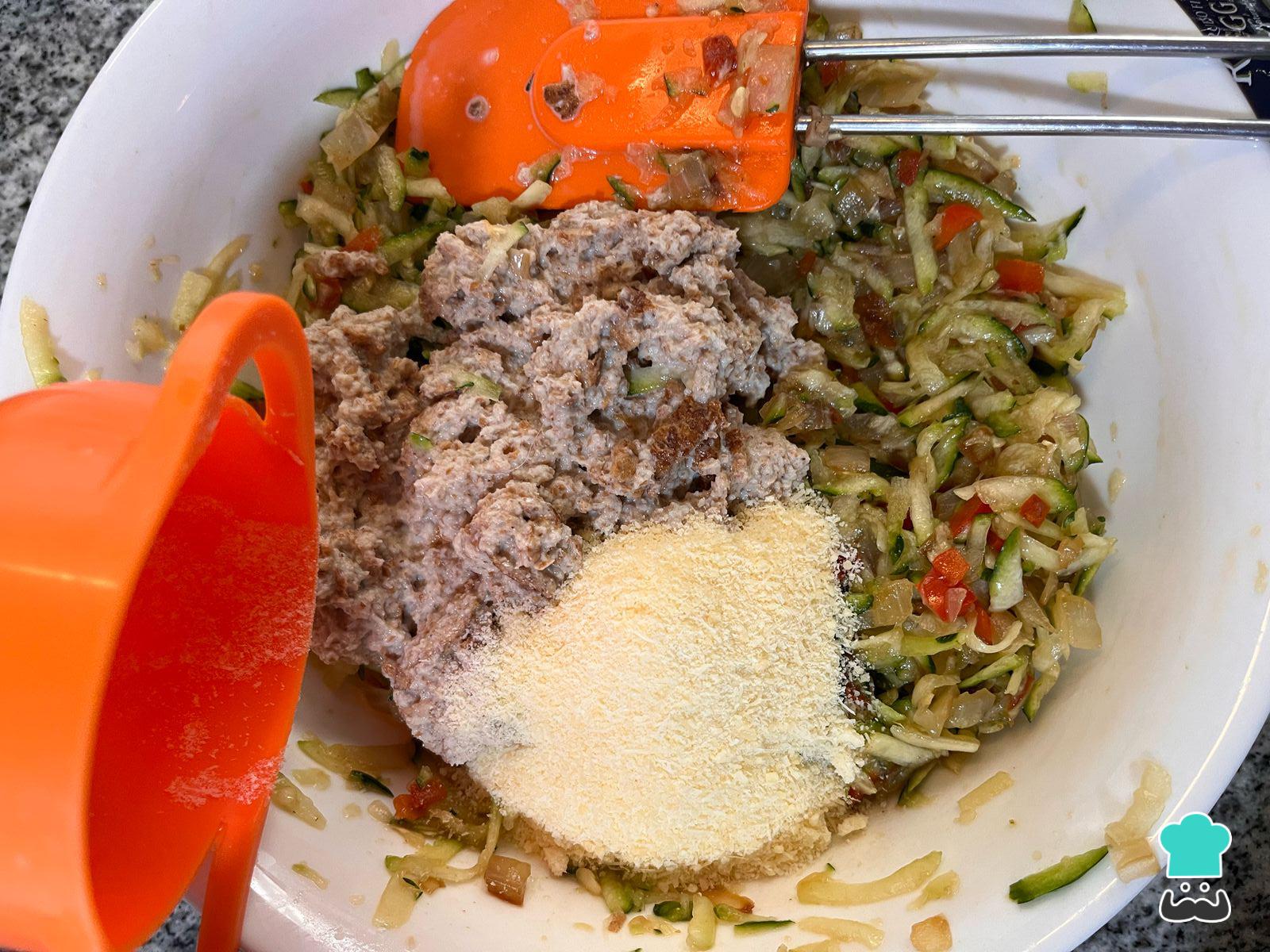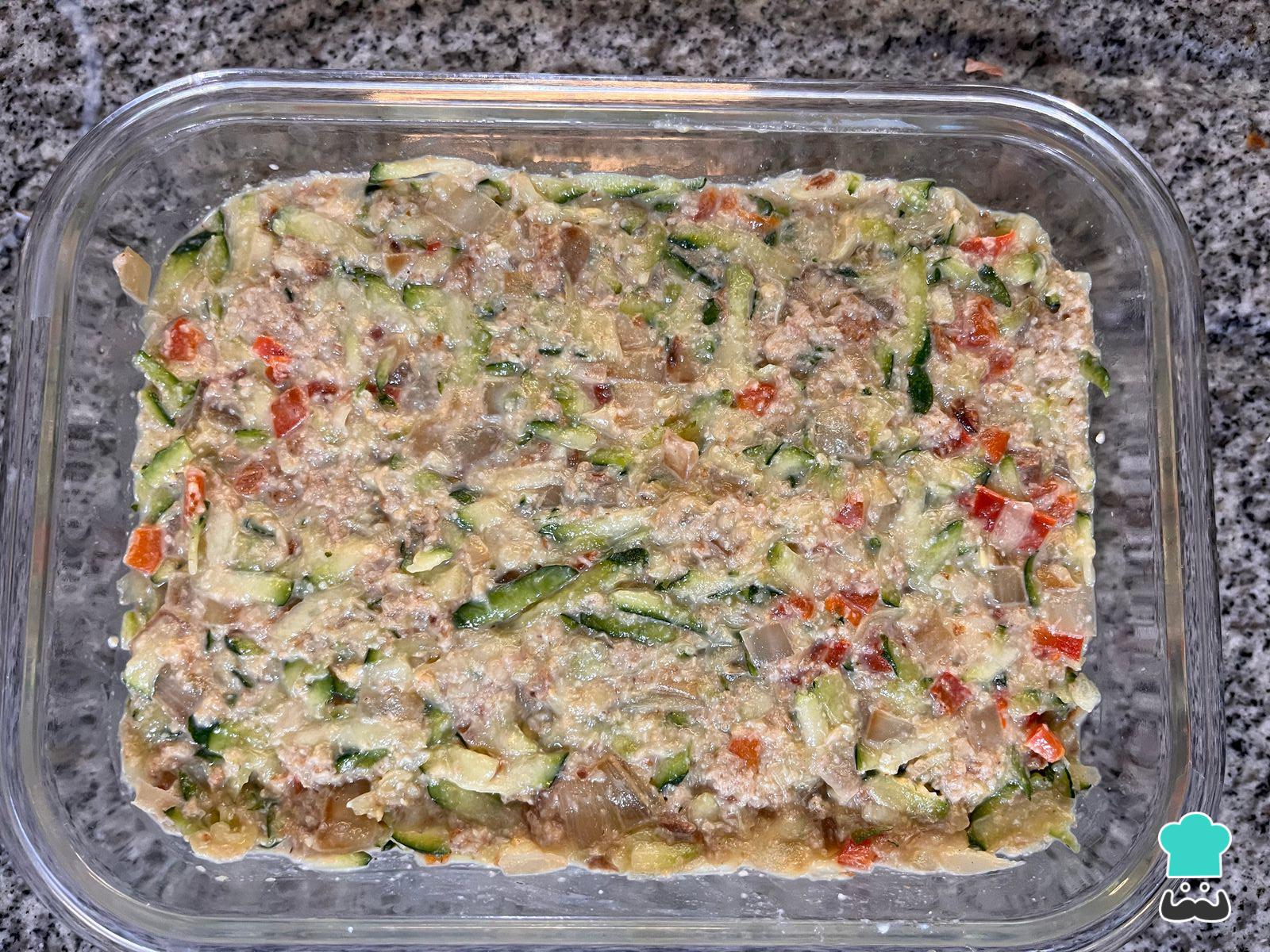 En un bol grande añade el zapallo italiano y el sofrito de cebolla y pimentón.