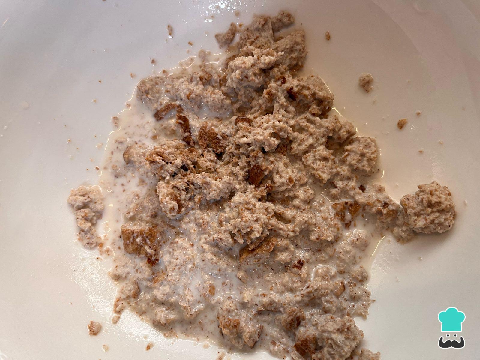 En un bol añade la leche líquida y el pan, deja remojando por 30 minutos.
