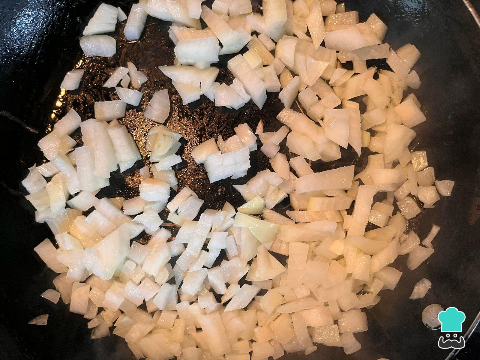 En una sartén añade el aceite y lleva a sofreír la cebolla con el ajo por un par de minutos a fuego medio alto.