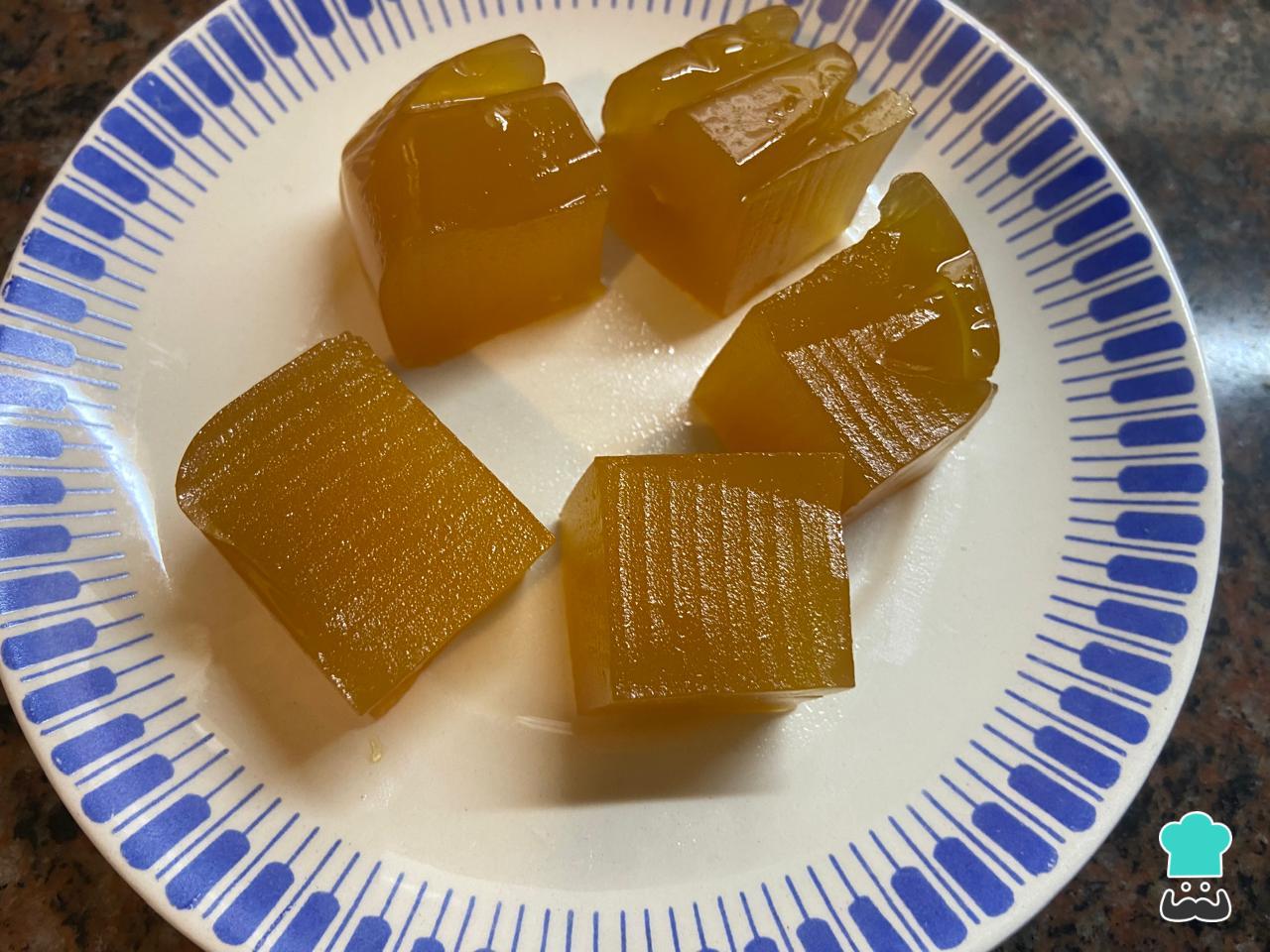 El primer paso consiste en cortar el dulce que hayas elegido en cubos de aproximadamente 2 x 2 cm. Puedes hacerlos todos de membrillo, todos de batata o un poco de cada sabor.
