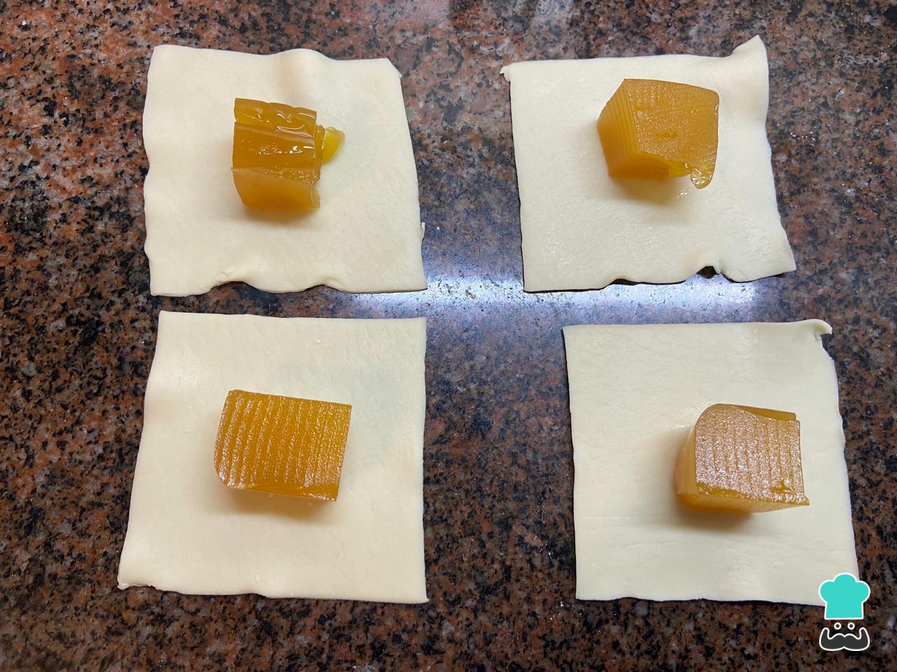 Distribuye la mitad de los cuadrados de masa para pastelitos sobre la mesada y coloca en el centro cada porción de dulce.