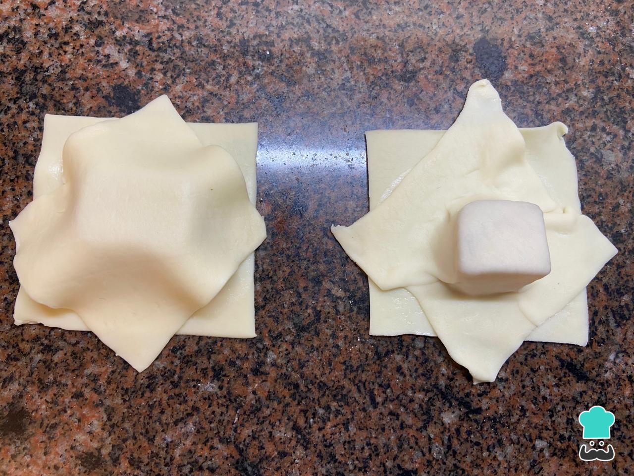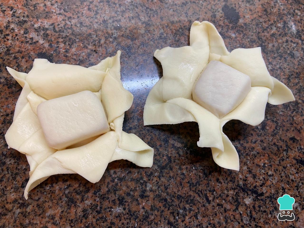 Humedece con agua la masa por alrededor del dulce y coloca otro cuadrado de masa a modo de tapa y en sentido opuesto, como si fuera un rombo. Luego, presiona bien alrededor del dulce (donde humedeciste) para pegar ambas capas.