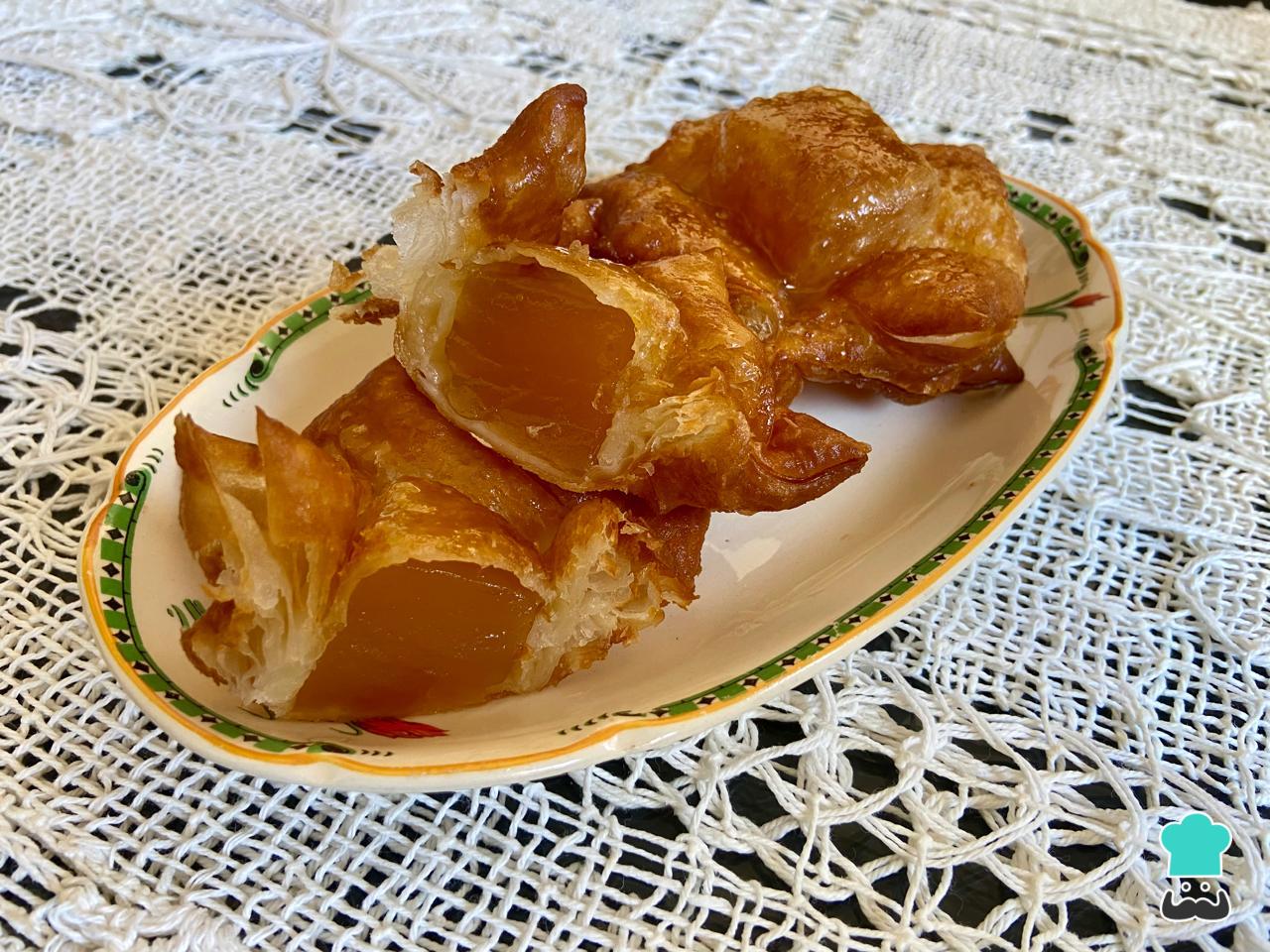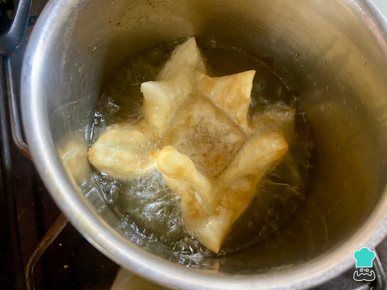 Coloca aceite en una olla y lleva al fuego. Cuando se haya calentado, fríe los pastelitos cuidando que no se quemen y rotándolos con una espumadera para que se doren de forma pareja.