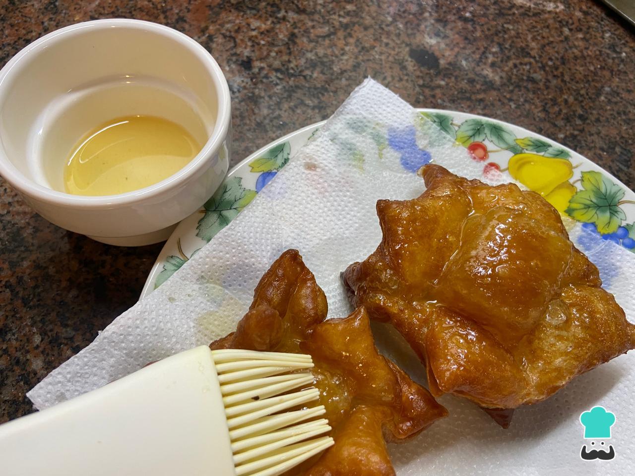 Vierte la miel en un recipiente, agrega una cucharada de agua y diluye sobre el fuego o en el microondas. A medida que retires los pastelitos del aceite, sécalos con papel absorbente y pincela con la reducción de miel para proporcionar más brillo y sabor.