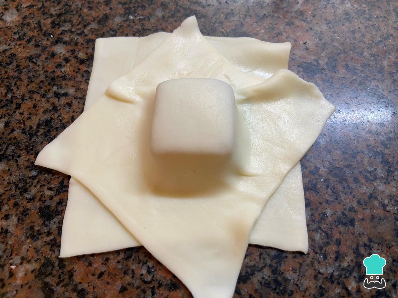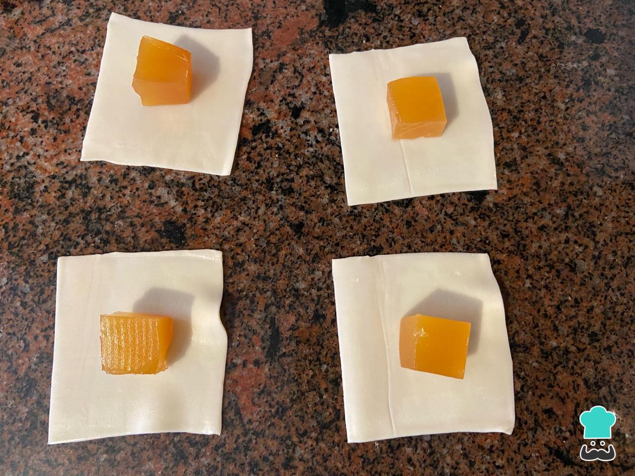 Distribuye la mitad de las tapas de pastelitos sobre la mesada y coloca en el centro una porción de dulce.
