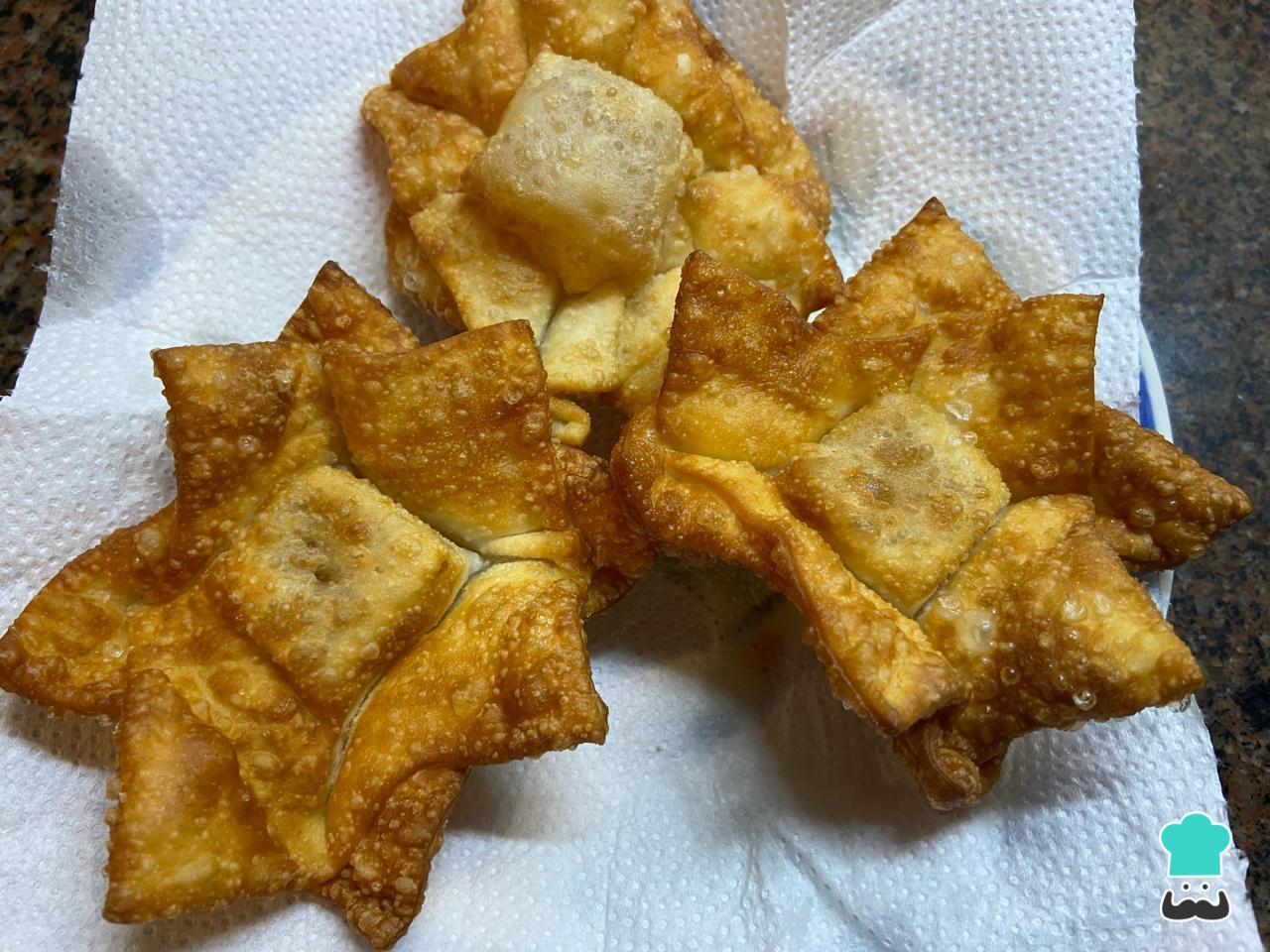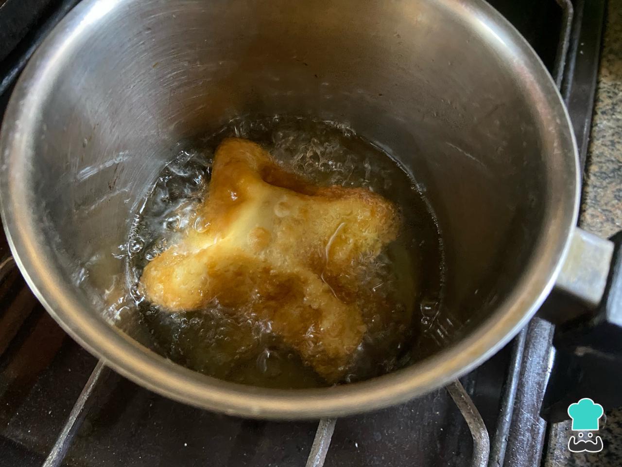 Para la cocción, vierte el aceite en una olla y lleva al fuego medio. Cuando el aceite alcance los 140 °C, introduce el pastelito y déjalo un par de minutos. Luego, sube el fuego a temperatura fuerte para que el aceite alcance los 170 / 180 °C y deja que se sigan cocinando hasta dorar. Si es necesario, rótalos para que la cocción sea pareja.
