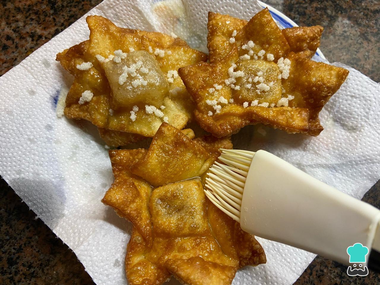 Para terminarlos, coloca la miel en un recipiente apto para microondas, añade una cucharada de agua diluye en microondas 30 segundos a potencia máxima. Pincela los pastelitos con la miel y espolvorea con azúcar granulada.