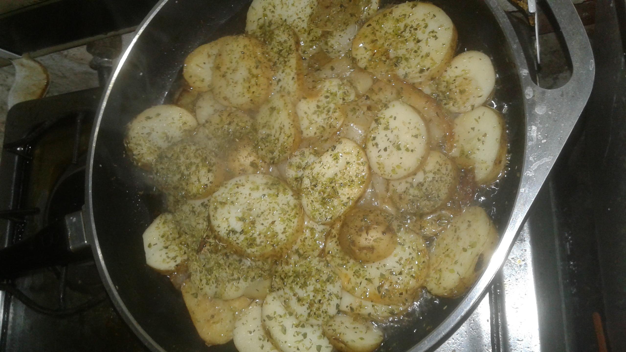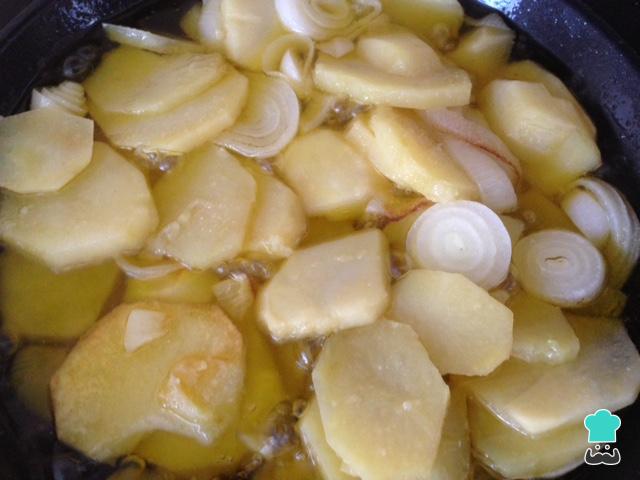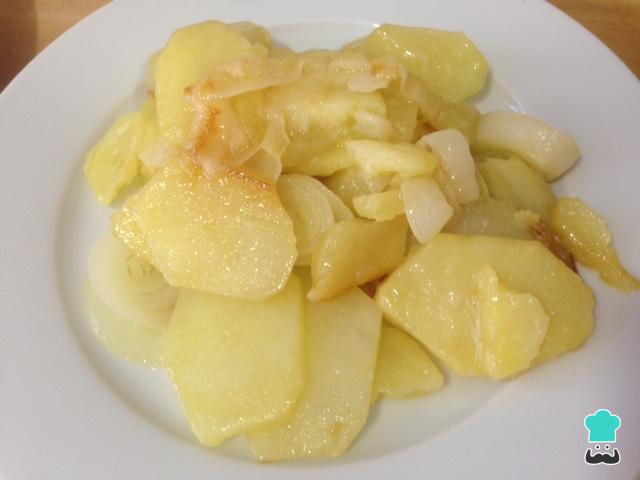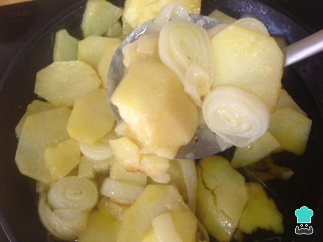 A continuación, añadimos las patatas y movemos un poco para que se mezclen con las cebollas.