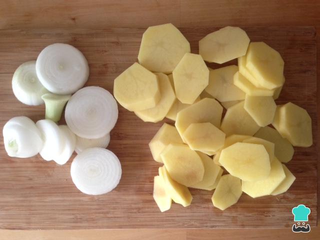 Cortamos las verduras tal y como indicamos en la imagen: pelamos las patatas, las lavamos y las cortamos en rodajas no muy finas. Por otro lado, pelamos las cebollas y las cortamos también en rodajas. Ponemos un poco de sal.