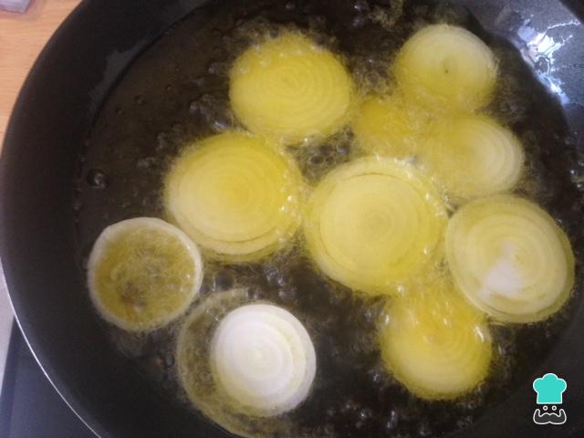 Ponemos el aceite a calentar en una sartén a fuego medio y añadimos las cebollas. Dejamos cocinar durante tres minutos.