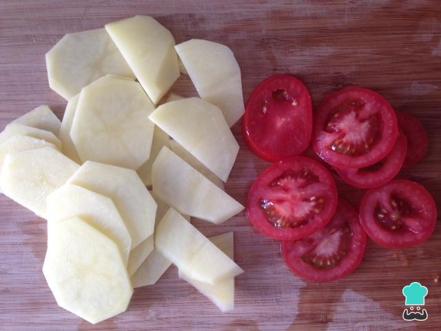 Pelamos las patatas y las cortamos en rodajas. Cortamos también los tomates en rodajas.