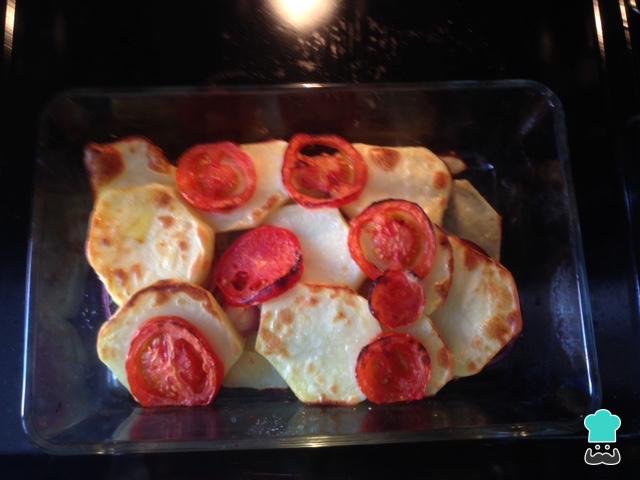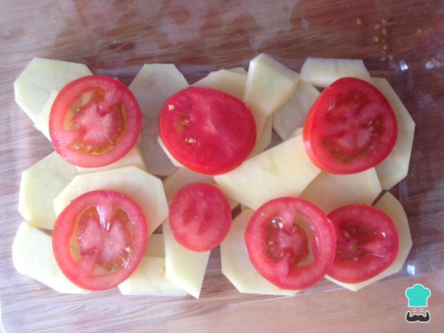 En una fuente para horno colocamos una capa de patatas, ponemos un poco de sal y colocamos otra capa de tomates encima. Si queréis que las patatas tarden menos en estar listas podéis cocerlas ligeramente en agua hirviendo antes de meterlas en el horno.