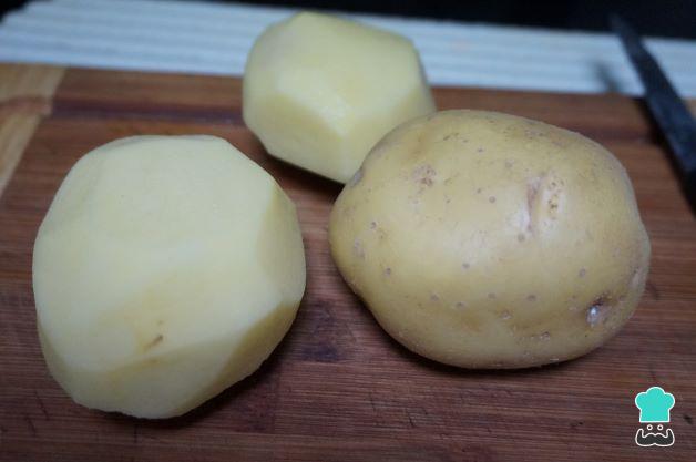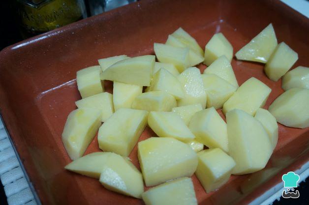 Encendemos el horno a 180 ºC con calor arriba y abajo. Prepara las patatas, pela y lava bien las patatas. Córtalas en trozos cuadrados que sean más o menos del mismo tamaño para que se cocinen por igual.