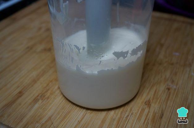 Prepara una mayonesa en el vaso de la batidora y añade un buen chorro de aceite de girasol, un poco de sal y un huevo entero. Bate y añade más aceite hasta que se haga la mayonesa.