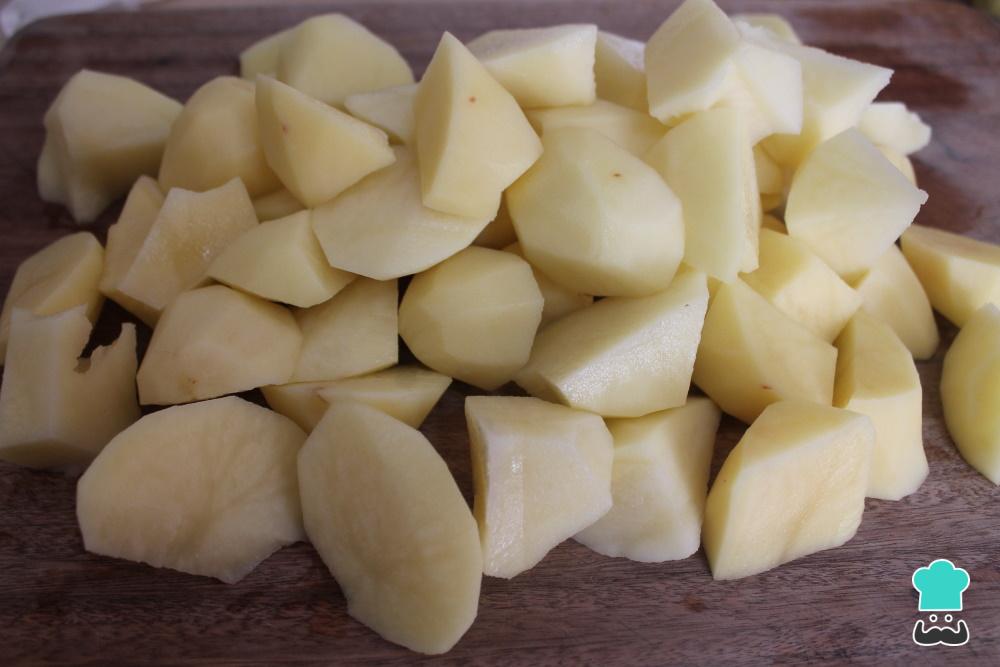 Antes de conocer cómo hacer las patatas bravas de Chicote, hay que preparar las patatas. Pela, lava y sécalas. Córtalas en cachelos, chascando los trozos, metiendo el cuchillo y luego partiendo para que suelten el almidón a la hora de cocinarlas.