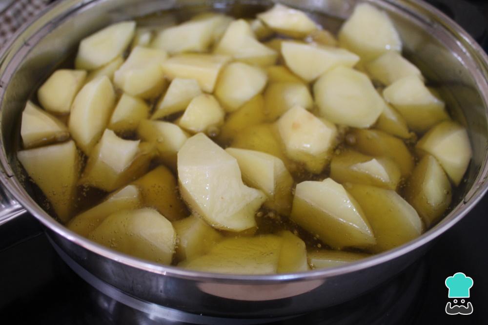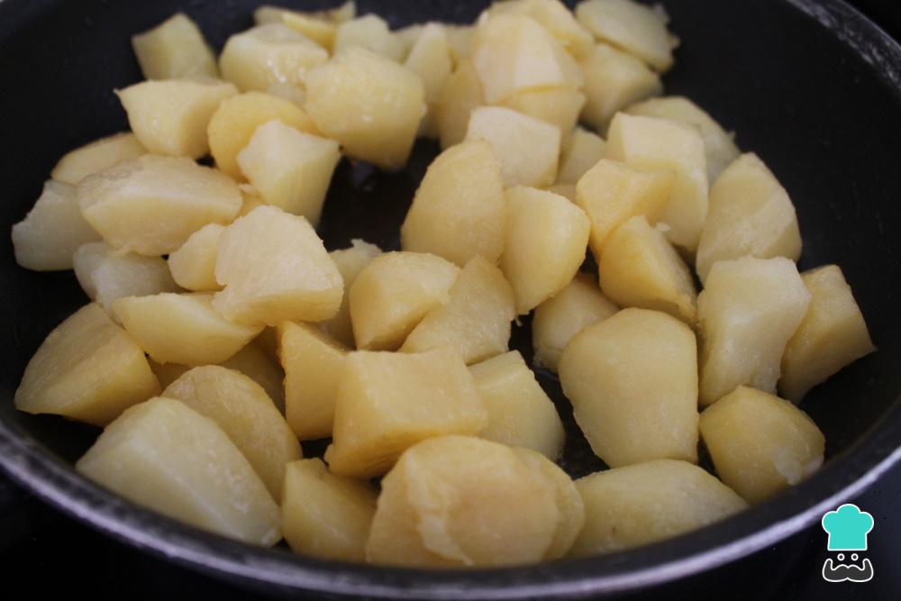 Pon el aceite de oliva en una sartén amplia y caliéntalo. Cuando el aceite esté listo, fríe las patatas unos 10 minutos a fuego no muy fuerte. Las patatas se tienen que hacer, pero no dorarse.