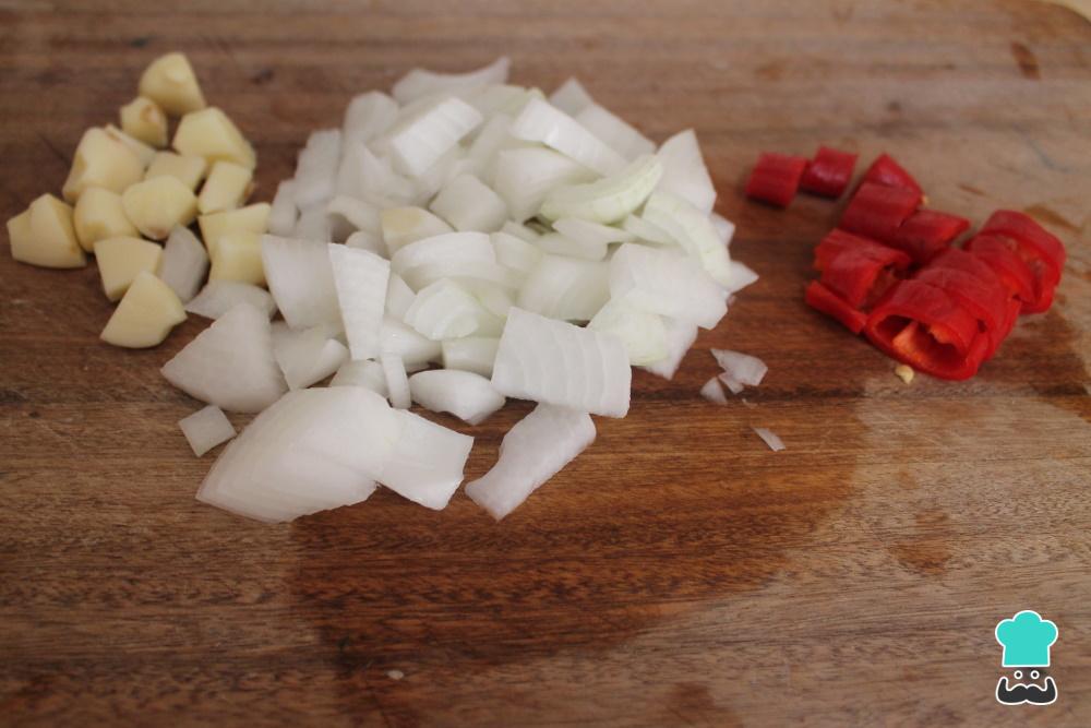Ahora, vamos con la preparación de la salsa brava de Chicote. Para ello, pela los dientes de ajo y la cebolla. Corta los ajos por la mitad y pica la cebolla en trozos no muy pequeños. Retira las semillas de los chiles y pártelos.