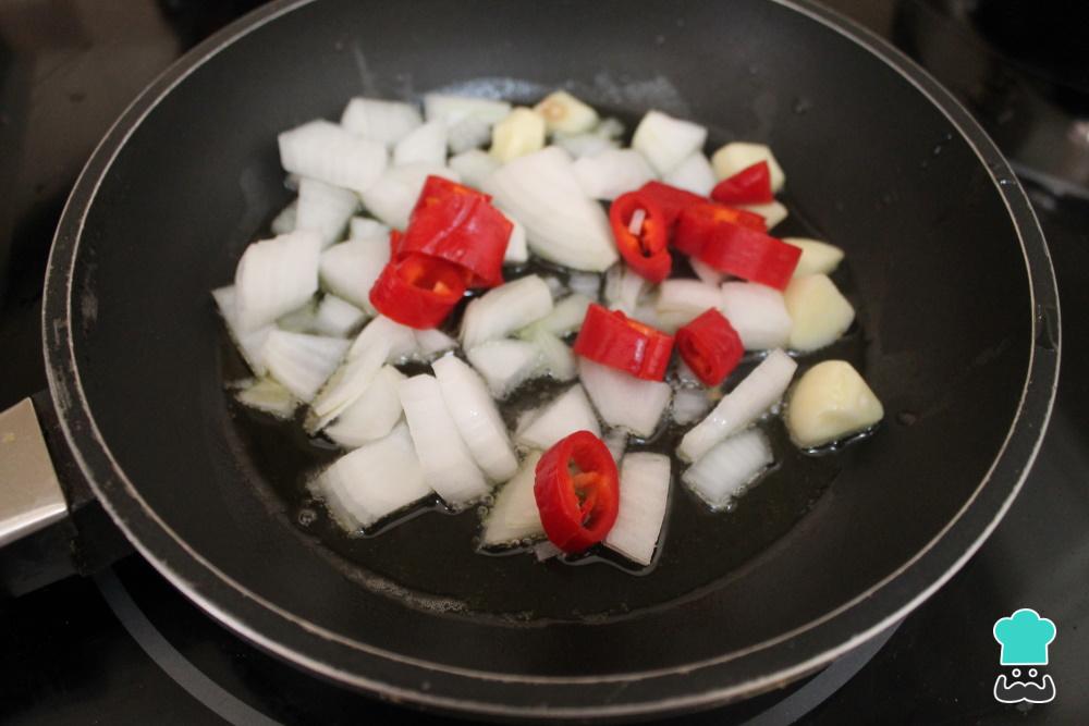En una olla pon un poco de aceite de oliva (reutiliza el mismo que has usado para freír las patatas). Pon suficiente aceite para cubrir el fondo de la olla y caliéntalo. Fríe los ajos, la cebolla y los chiles. Tardará unos cinco minutos.