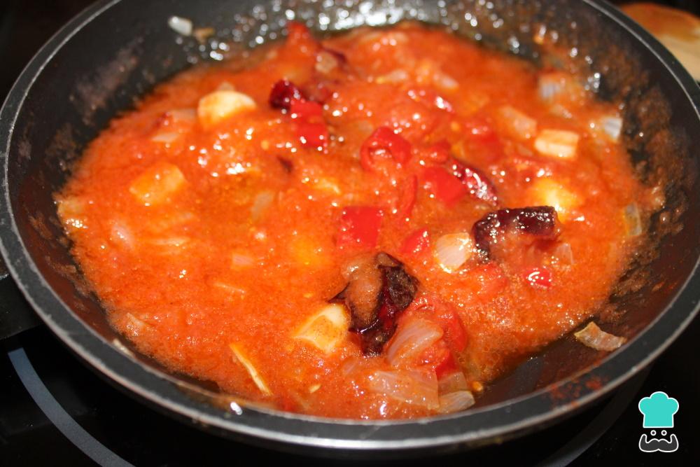 Incorpora la carne del pimiento choricero, el vinagre, la punta de jamón, el pimentón picante y el tomate triturado. Tapa la olla y deja cocer a fuego medio unos 10 minutos.