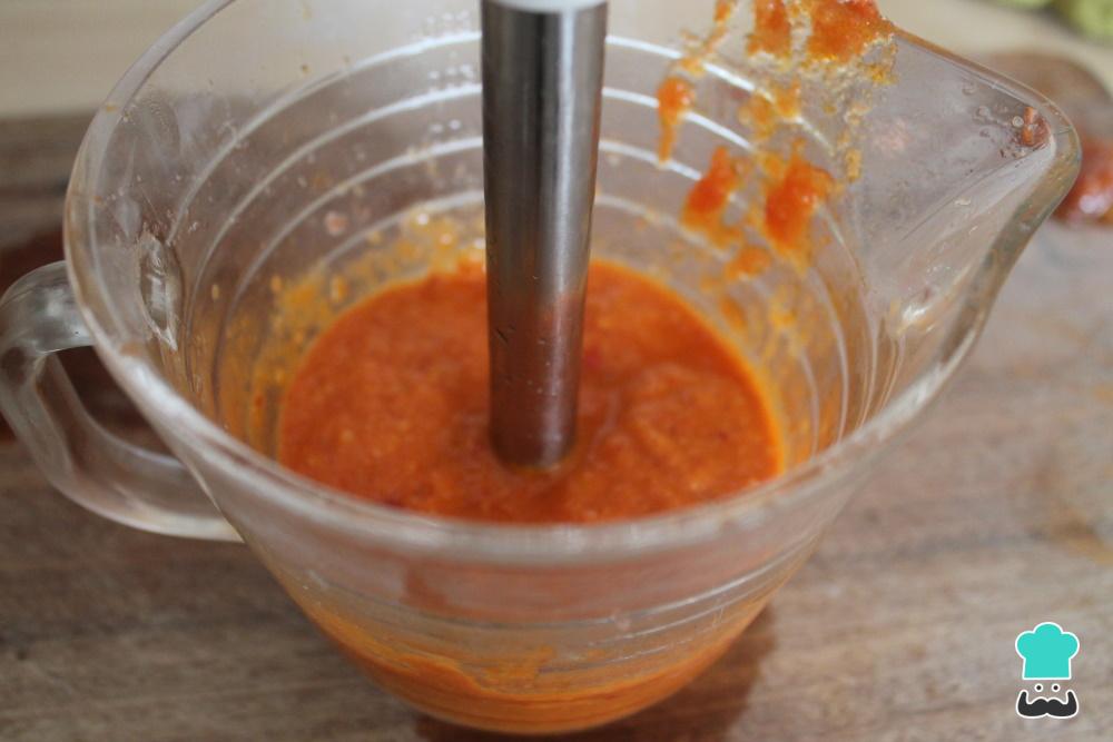 Una vez cocido, prueba la salsa, tal vez necesite un poco de sal, o esté un poco ácida por el tomate, por lo que habrá que añadirle un poco de azúcar. Retira la punta de jamón y pasa la salsa brava al vaso de la batidora y tritura.