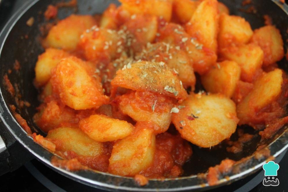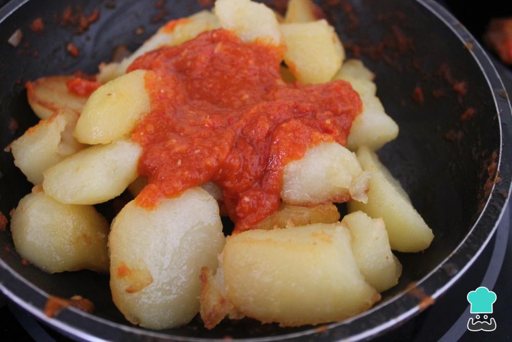Añade tres cucharadas soperas de la salsa y ve moviendo con cuidado para que las patatas se vayan impregnando de la salsa. Ve añadiendo más salsa brava hasta que tenga la consistencia que más te guste.