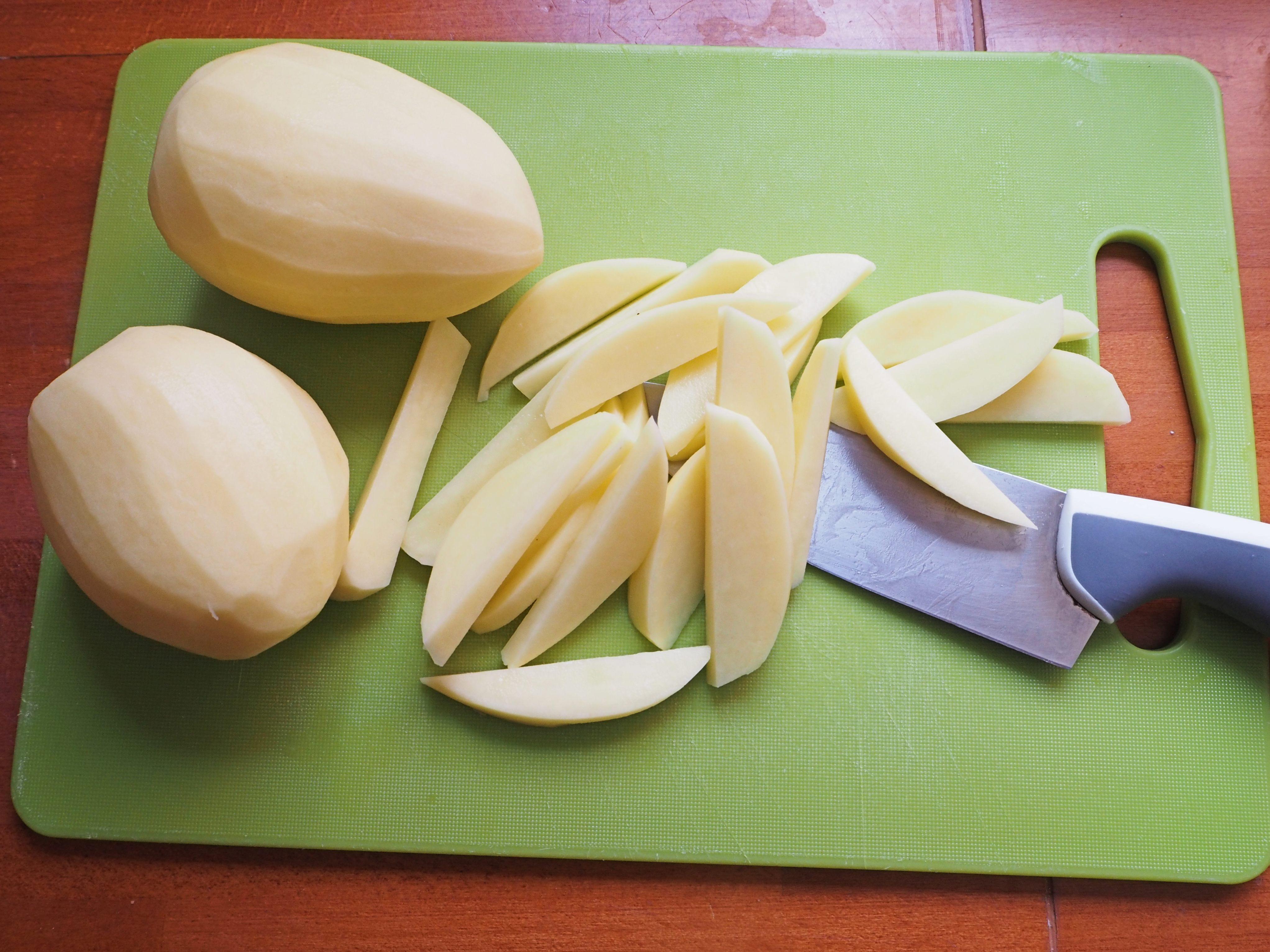 Antes de nada, cabe destacar que las cantidades de los ingredientes irán en función del número de comensales. Dicho esto, lavamos y pelamos las patatas (con piel también quedan muy buenas). Las cortamos en gajos para hacer las patatas deluxe especiadas, o en la forma que nos guste.