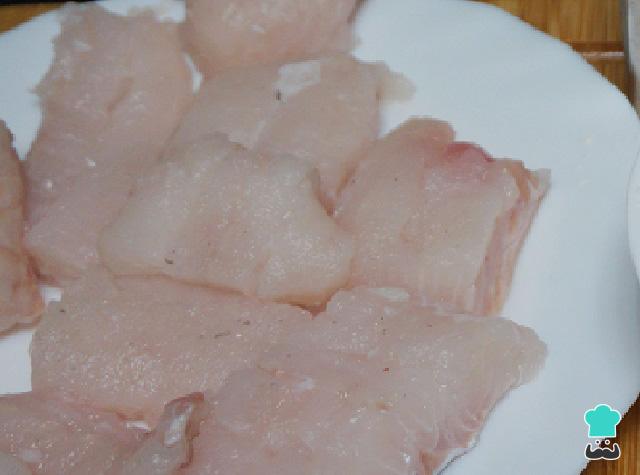 Cortamos la merluza en trozos similares y salamos al gusto. Recomendamos retirar las espinas con antelación para no encontrarnos sorpresas al comer las pavías de merluza.