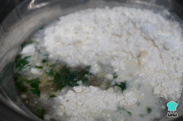En un bol, ponemos todos los ingredientes para preparar el rebozado. Así, añadimos el ajo y el perejil picados, la harina tamizada con la levadura, la cerveza y un poco de agua. Removemos todo hasta que nos quede una crema espesita. Si hace falta, añadimos más agua.