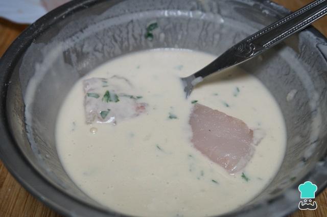 Ahora que tenemos la masa para hacer pavías de merluza preparada, introducimos en ella los tacos de pescado y los cubrimos bien.
