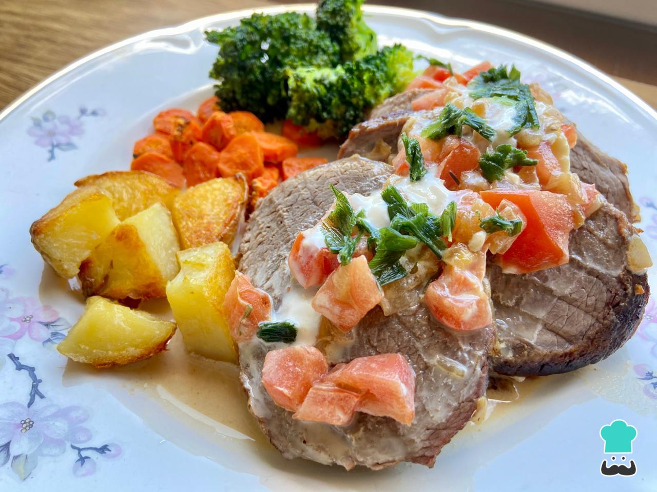 Retira la fuente del horno y abre la bolsa, vierte la crema de leche y el tomate fresco cubeteado. Vuelve a llevar al horno con la bolsa abierta durante 20 minutos más. Antes de cortar y servir la carne, deja reposar 5 minutos. Decora con cebolla de verdeo u hojas de albahaca picadas.