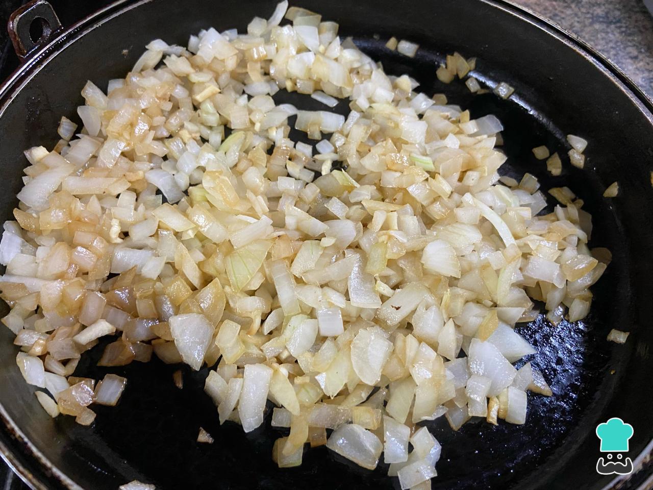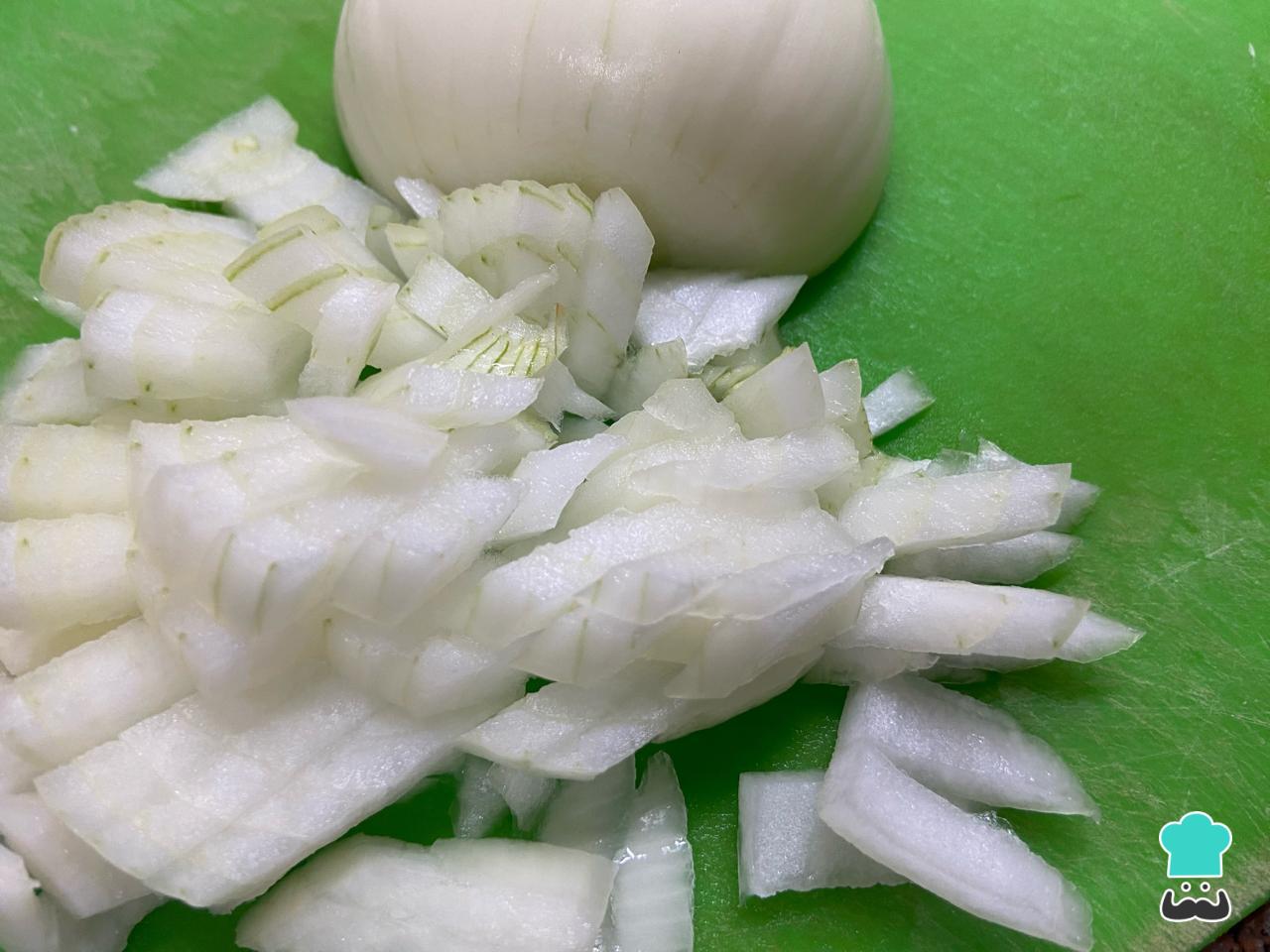 Pela y pica una cebolla. Enciende el horno para precalentarlo a 170 °C.